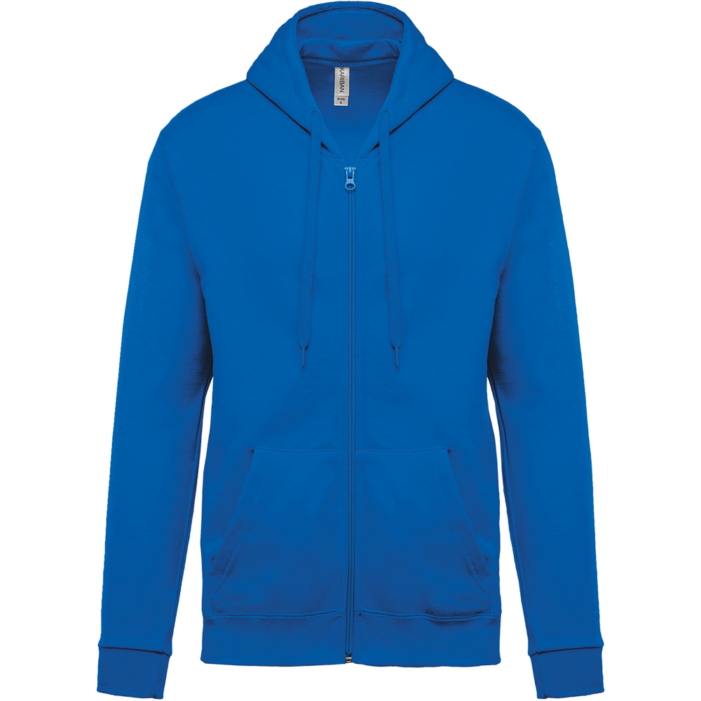 80% katoen / 20% polyester. Gekamd katoen. Geborsteld fleece aan de binnenkant. Ingezette mouwen. Nylon ritssluiting. Gevoerde capuchon met toon op toon aanrijgkoordjes. Kangoeroezakken. Ribboord aan mouwuiteinden en aan de onderkant.