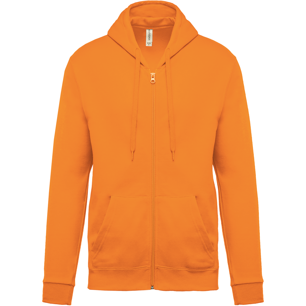 80% katoen / 20% polyester. Gekamd katoen. Geborsteld fleece aan de binnenkant. Ingezette mouwen. Nylon ritssluiting. Gevoerde capuchon met toon op toon aanrijgkoordjes. Kangoeroezakken. Ribboord aan mouwuiteinden en aan de onderkant.