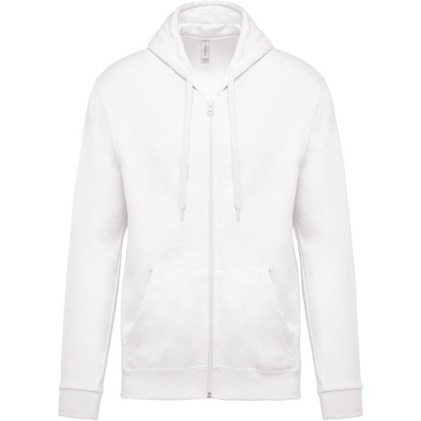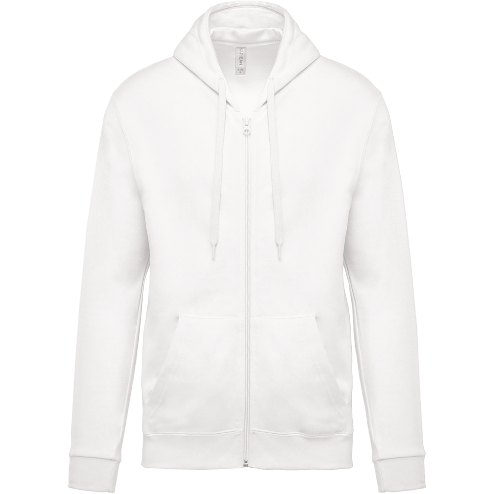 80% katoen / 20% polyester. Gekamd katoen. Geborsteld fleece aan de binnenkant. Ingezette mouwen. Nylon ritssluiting. Gevoerde capuchon met toon op toon aanrijgkoordjes. Kangoeroezakken. Ribboord aan mouwuiteinden en aan de onderkant.