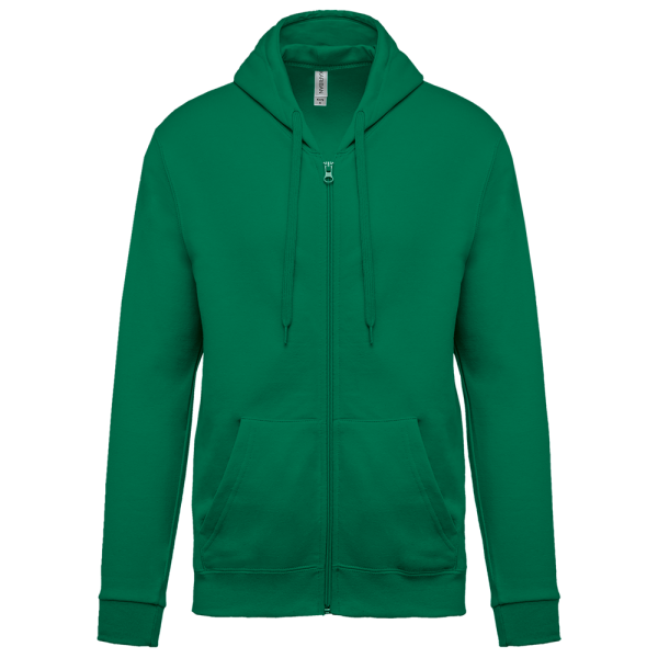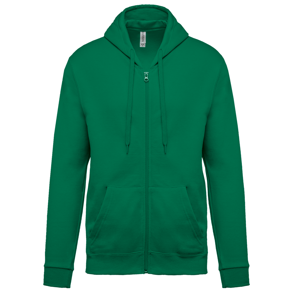 80% katoen / 20% polyester. Gekamd katoen. Geborsteld fleece aan de binnenkant. Ingezette mouwen. Nylon ritssluiting. Gevoerde capuchon met toon op toon aanrijgkoordjes. Kangoeroezakken. Ribboord aan mouwuiteinden en aan de onderkant.