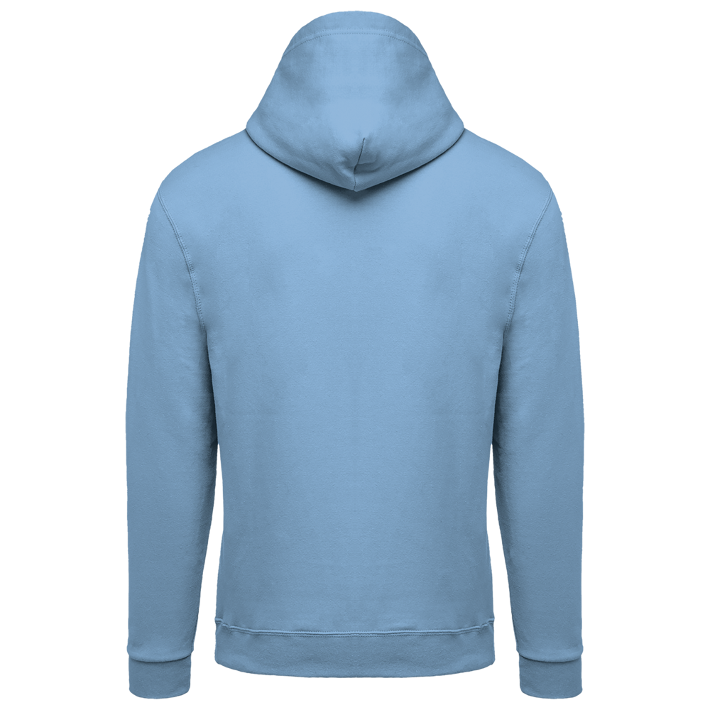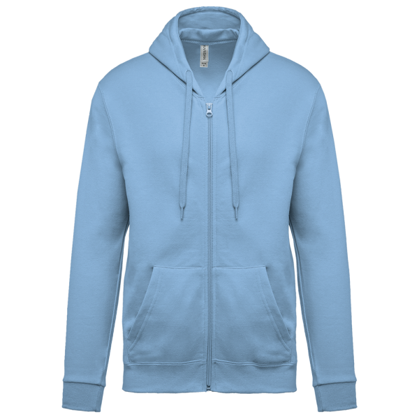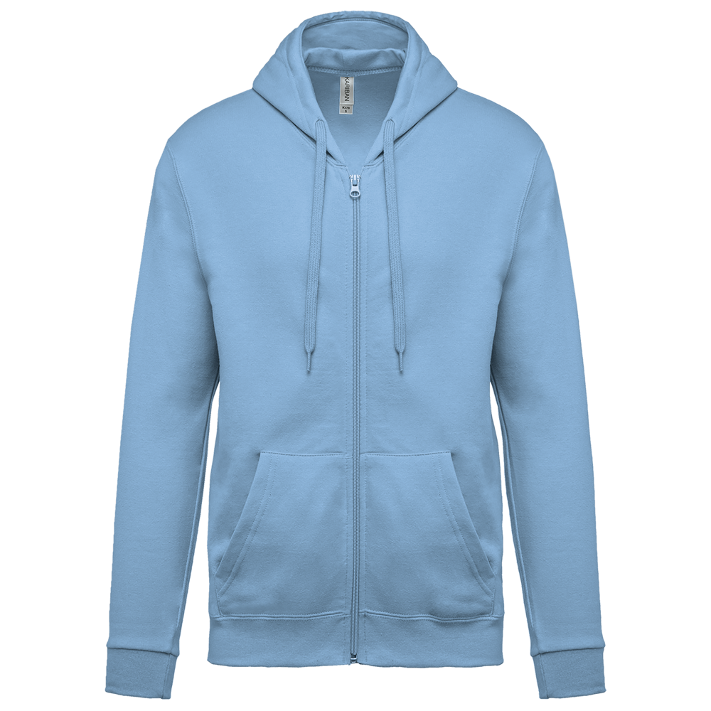 80% katoen / 20% polyester. Gekamd katoen. Geborsteld fleece aan de binnenkant. Ingezette mouwen. Nylon ritssluiting. Gevoerde capuchon met toon op toon aanrijgkoordjes. Kangoeroezakken. Ribboord aan mouwuiteinden en aan de onderkant.