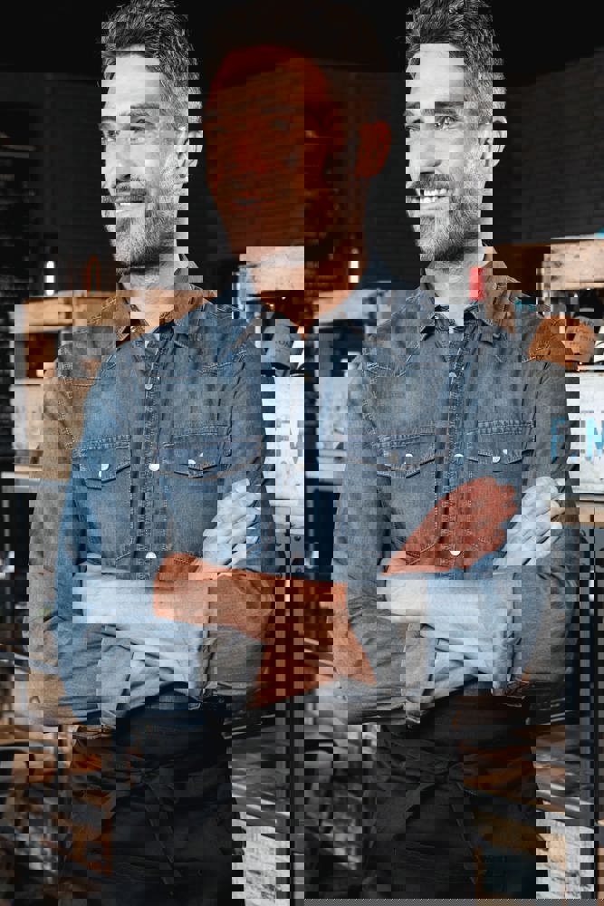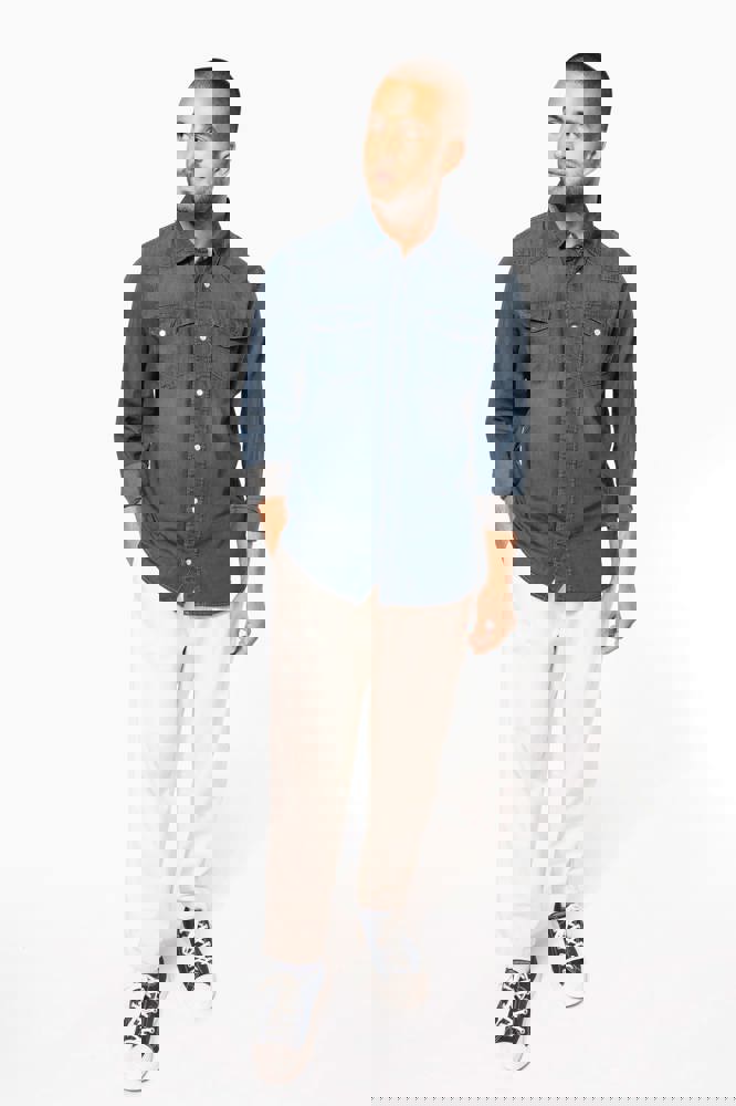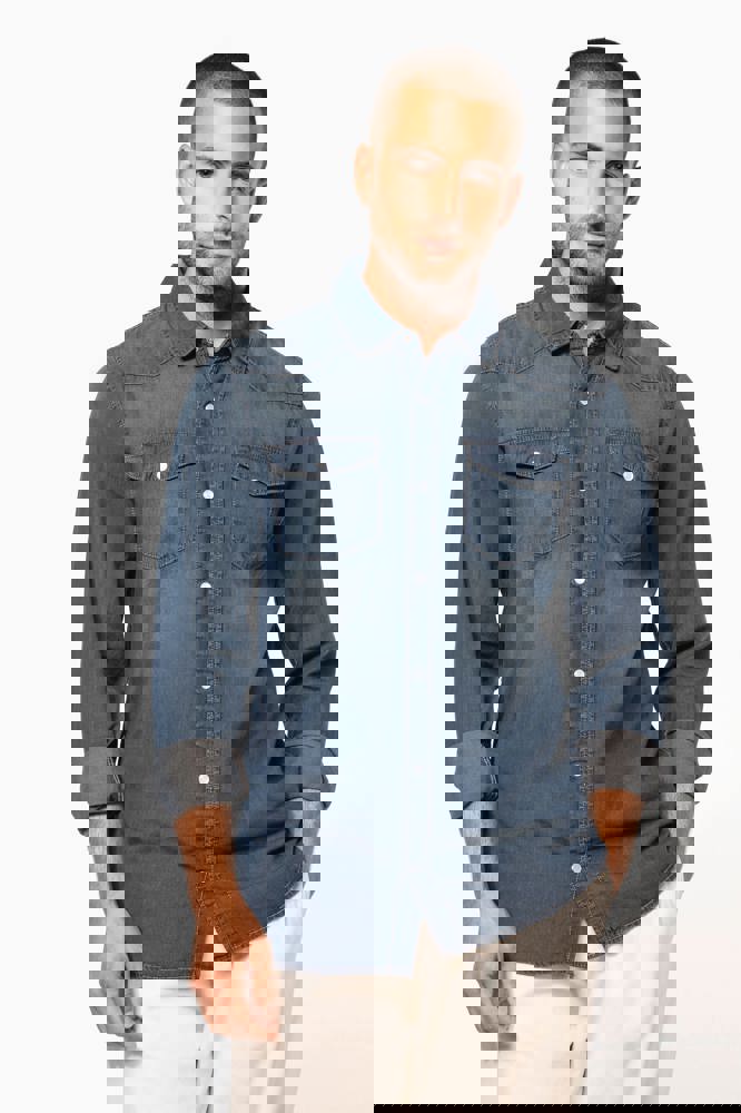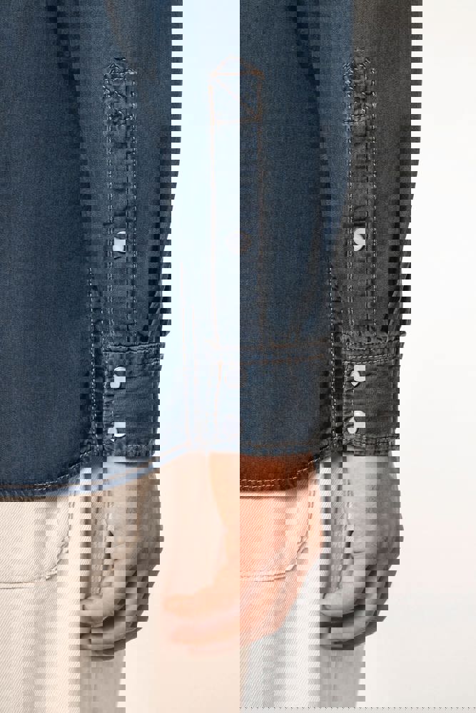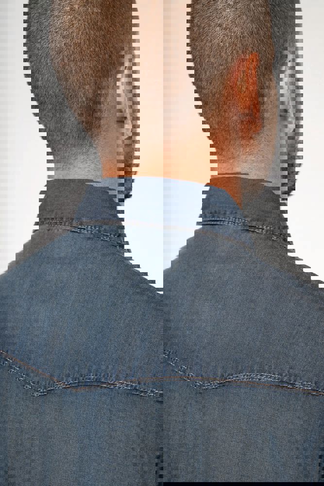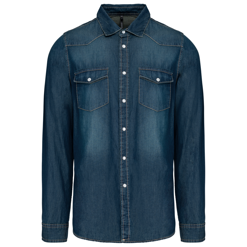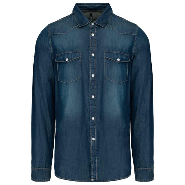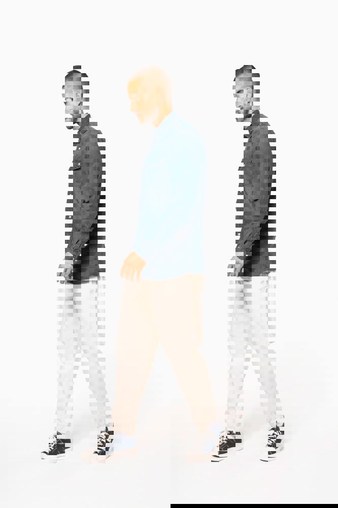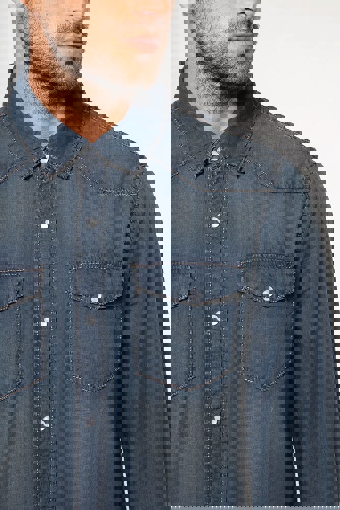 100% katoen. Gewassen met enzymen. Rechte snit. Fantasie drukknopen. 2 borstzakken met overslag en drukknoop. Inzetstukken aan de rug en voorkant. Mouwuiteinden met drukknopen. Dit product kreeg een speciale behandeling om het er verouderd te laten uitzien. Dit ambachtelijke procedé maakt dat er kleurverschillen zijn tussen de producten, waardoor elk stuk uniek is.