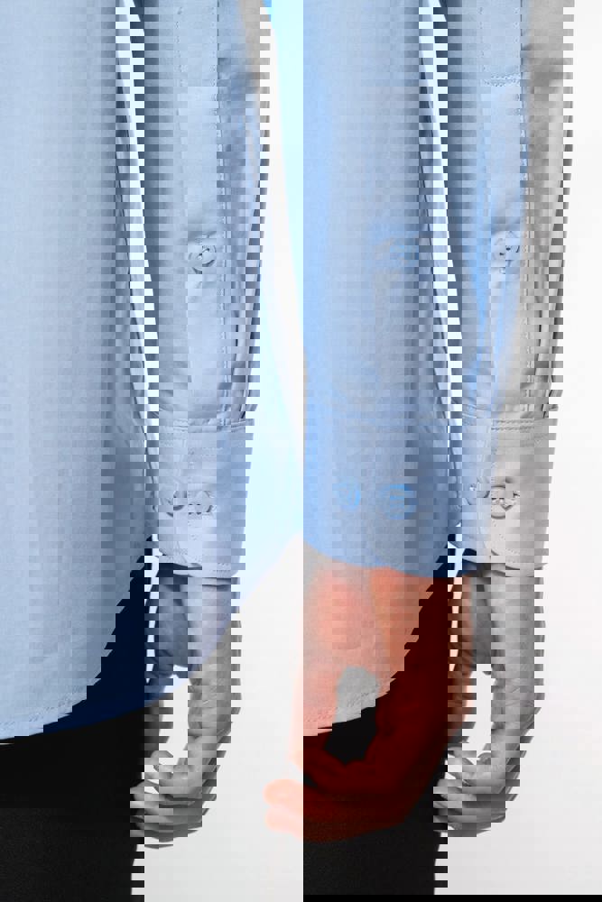 100% popeline katoen. Gemakkelijk in onderhoud (Easy Care). Verstevigde kraag met baleinen. Toon op toon knopen. Borstzakje. Dubbel inzetstuk op de rug en 2 plooitjes. Afgewerkt met dubbele vouwnaden. Verstelbare mouwen. 2 extra knopen. Afgerond boord aan de onderkant.