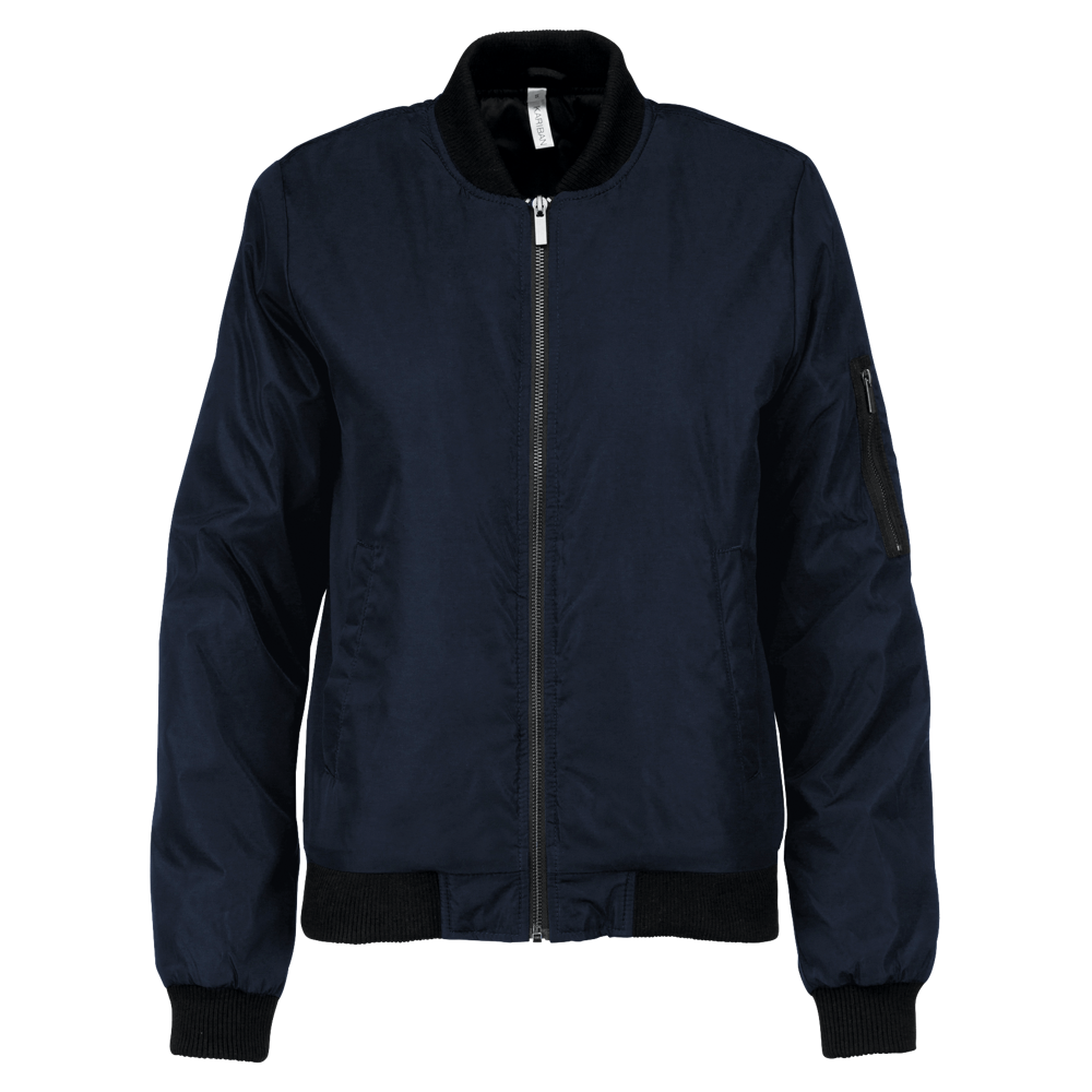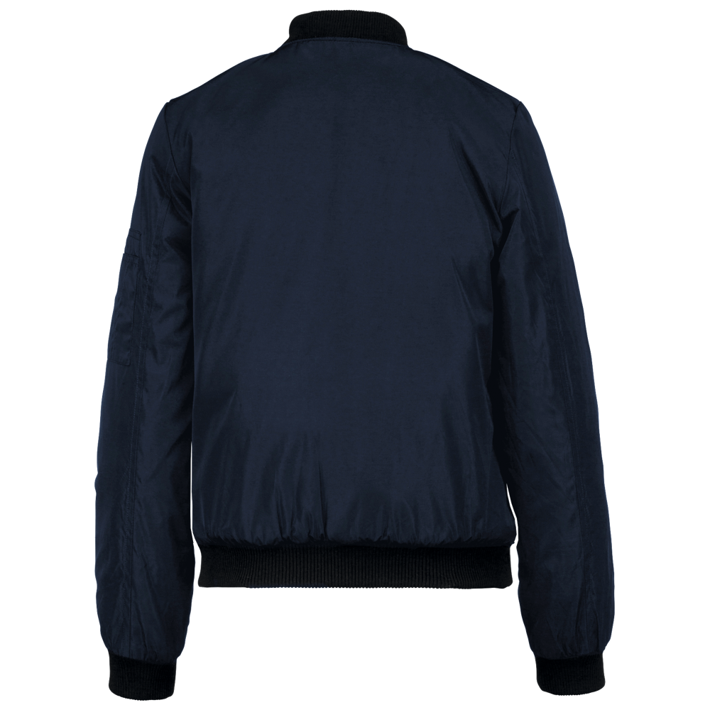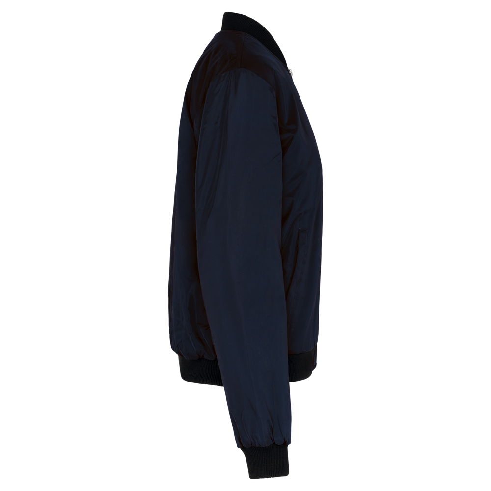 100% polyester. Gewatteerde voering van 100% polyester. Ritssluiting. 2 omzoomde zakken aan de voorkant. Opzetzak met rits en penzak op de linkermouw. Omzoomde binnenzak. 2x2 ribboord aan halsopening, mouwuiteinden en onderkant. 1 rits aan de linkerkant en 1 drukkersrits.