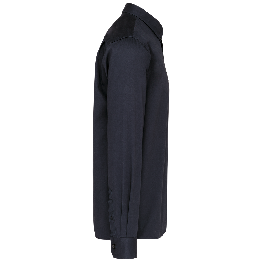 100% katoen. Fluweelachtige twillstof. Kraagpunt met knoop. Toon-op-toon knopen. Borstzak aan de linkerkant. Binnenkant kraagstaander en mouwuiteinden in contrasterende kleur Oxford silver. Achterkant met 2 ruimteplooien en gevoerd inzetstuk. Afgewerkt met omgeslagen naden. Verstelbare mouwuiteinden met knoop. Extra knoop.