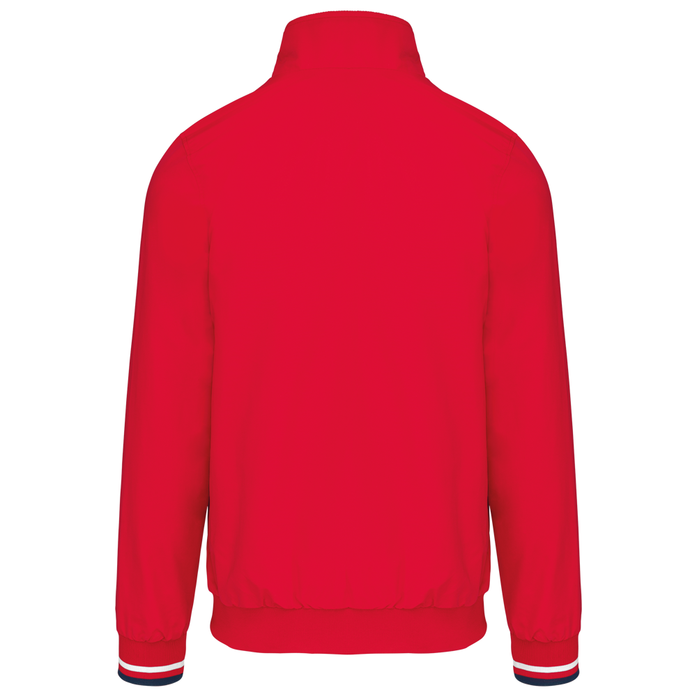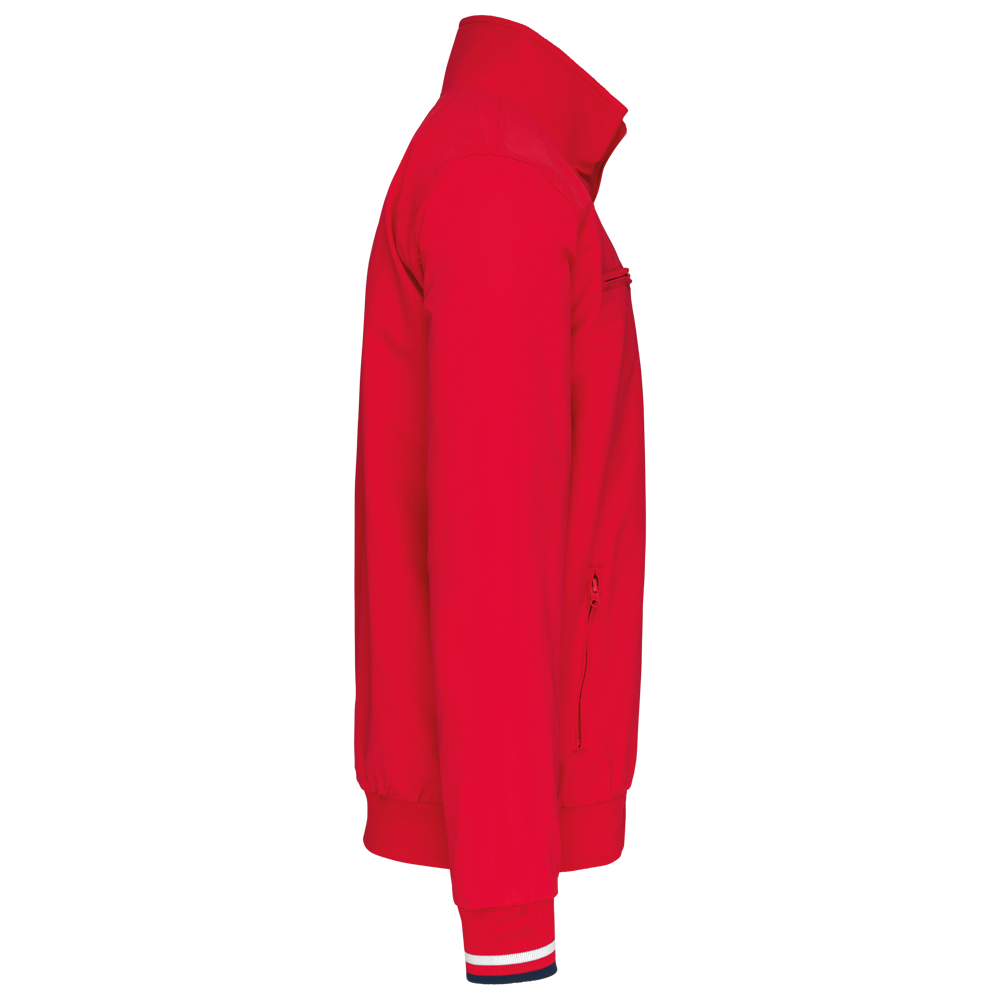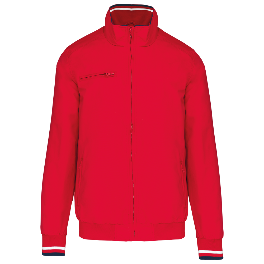 100% polyamide ottomaans taslon. Netvoering 100% polyester. Duurzame stof. 2 voorzakken met rits. 1 borstzak met rits. 1 binnenzak. Binnenkant kraag van in rib met geconstrasteerde strepen. Meshvoering met drukkersrits. Onderkant in rib. Mouwuiteinden in rib met gecontrasteerde strepen.