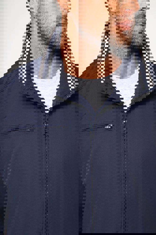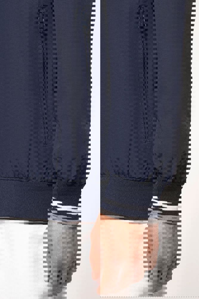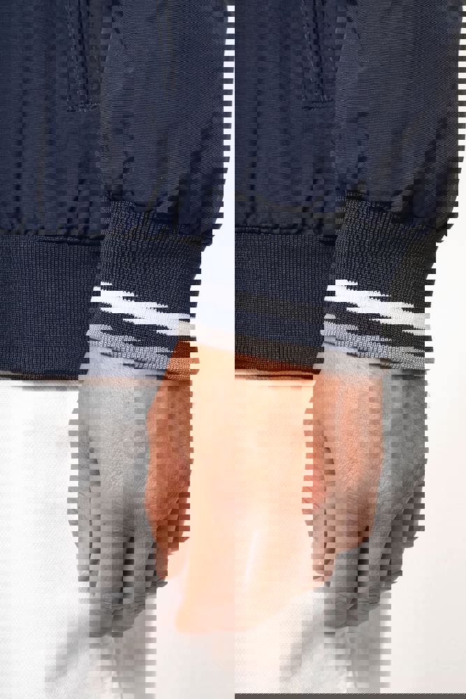 100% polyamide ottomaans taslon. Netvoering 100% polyester. Duurzame stof. 2 voorzakken met rits. 1 borstzak met rits. 1 binnenzak. Binnenkant kraag van in rib met geconstrasteerde strepen. Meshvoering met drukkersrits. Onderkant in rib. Mouwuiteinden in rib met gecontrasteerde strepen.
