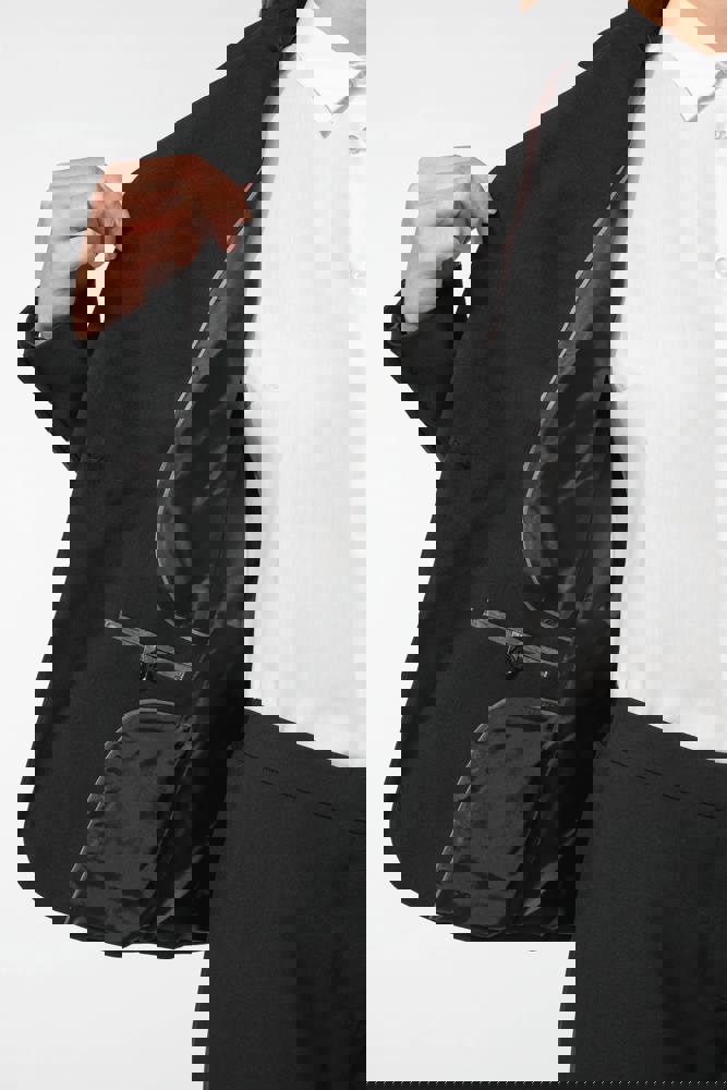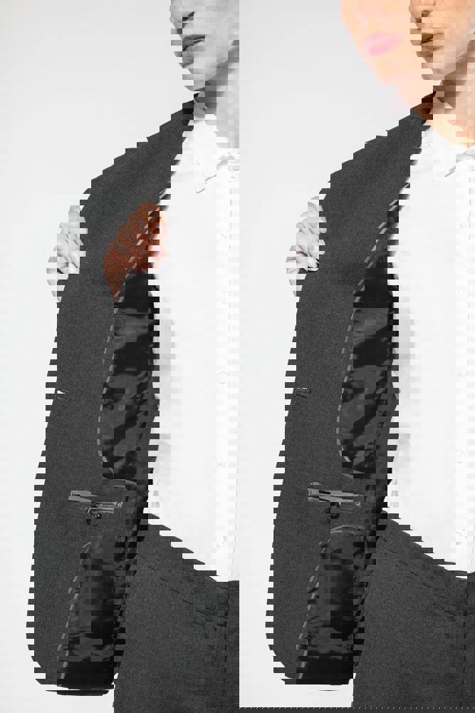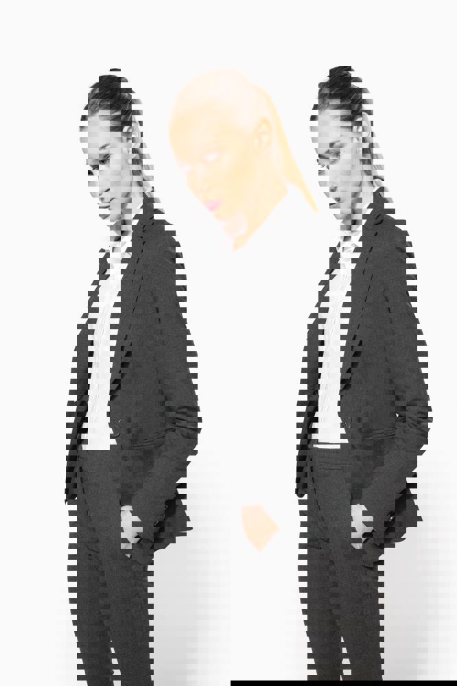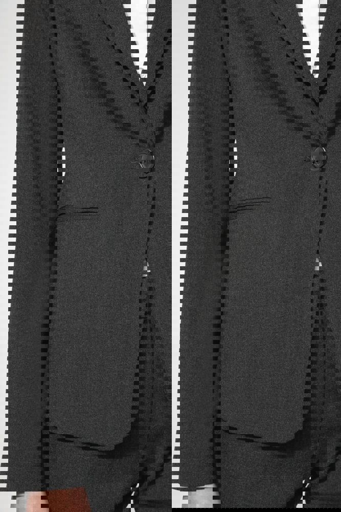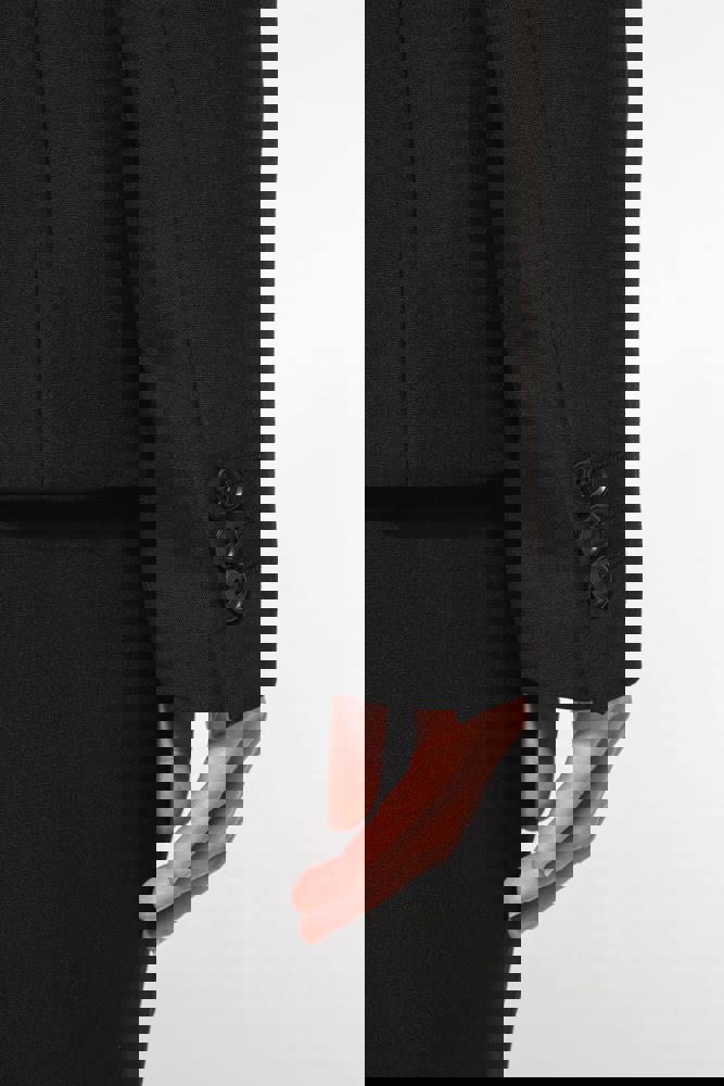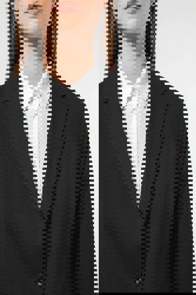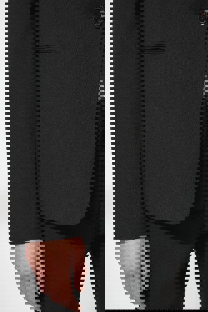 64% polyester / 34% viscose / 2% elasthan. Voering 100% tafpolyester. Jas met 1 knoop. 2 omzoomde zakken aan de voorkant. 2 binnenzakken met knoop. Mouwuiteinde met 3 knopen. 1 ruimtesplit op de achterkant.