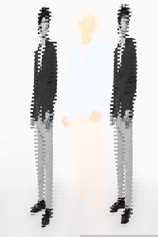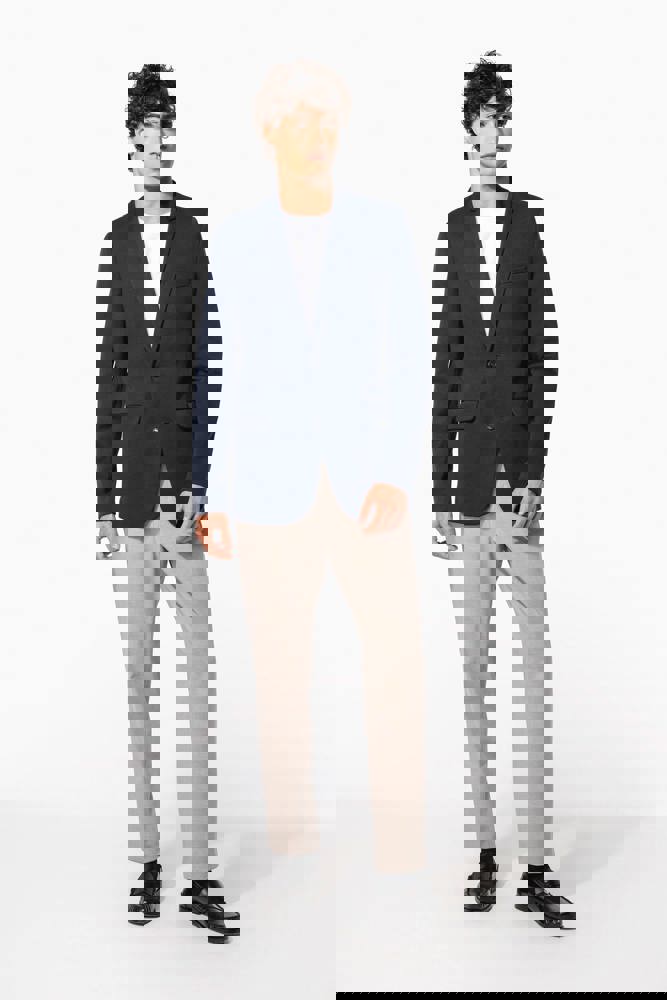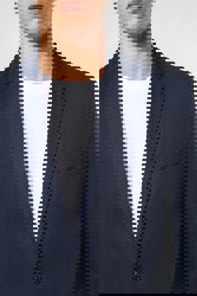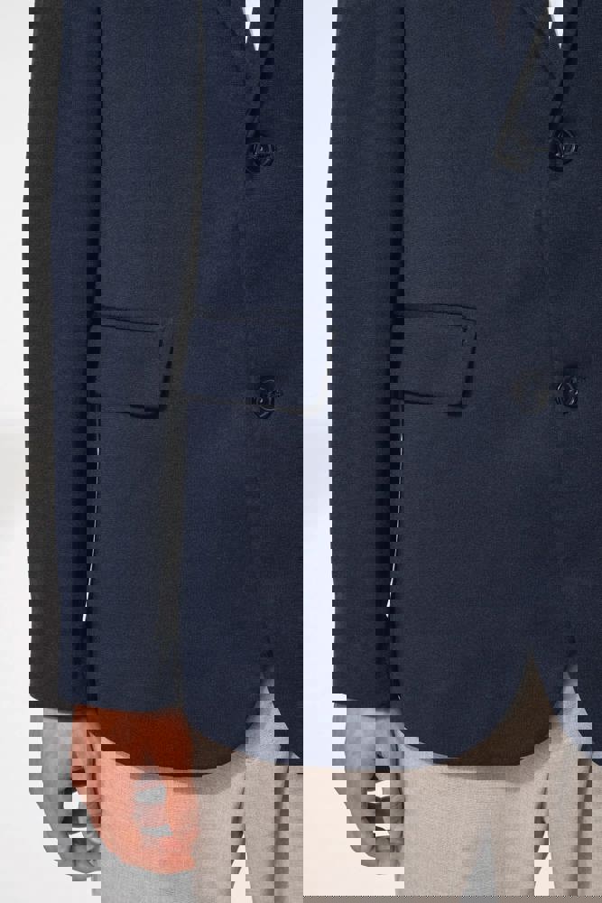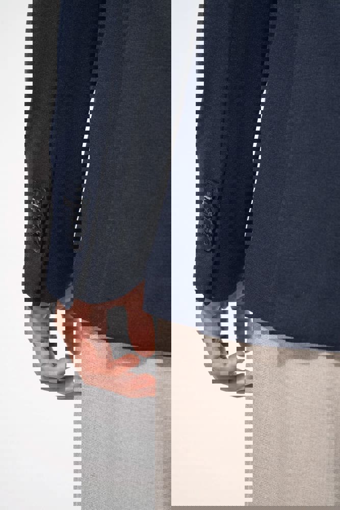 80% polyester / 18% katoen / 2% elasthan (Night navy heather) - 74% polyester / 24% viscose / 2% elasthan (Light grey heather). Interlock. Voering lichaam van polykatoen en mouwen van taffetas polyester. Jas met 2 knopen. Aan de voorkant 2 omzoomde zakken met klep en een borstzak. 2 binnenzakken met knoop en een gsm-zak. Contrasterende bies aan de binnenkant vooraan. Mouwuiteinde met 4 knopen, waarvan 1 met contrasterend knoopsgat. 2 ruimtesplitten op de achterkant. 1 blinde drukkersrits binnenin aan de voorkant links.