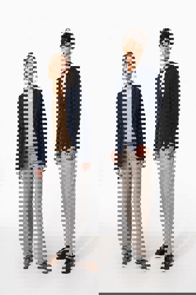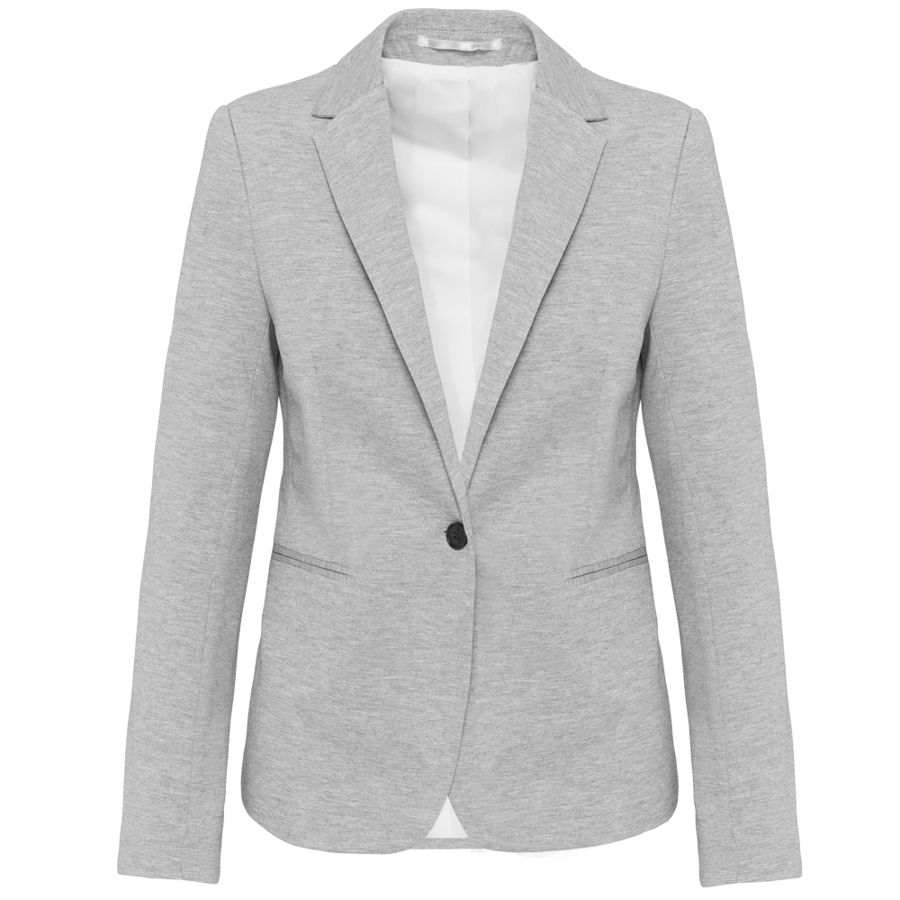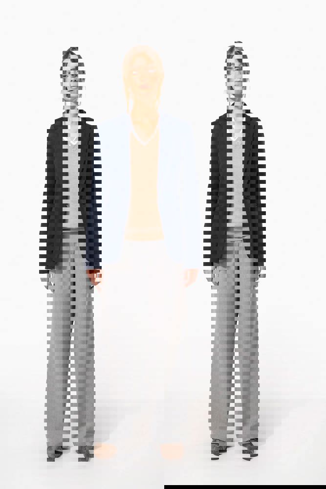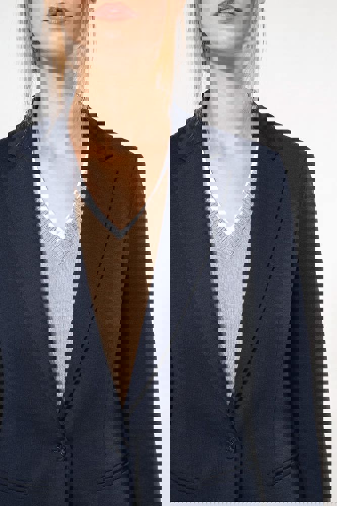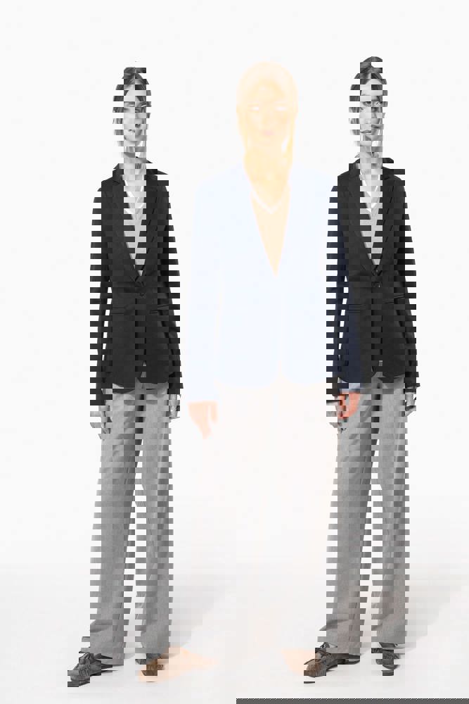 80% polyester / 18% katoen / 2% elasthan (Night navy heather) - 74% polyester / 24% viscose / 2% elasthan (Light grey heather). Interlock. Voering lichaam van polykatoen en mouwen van taffetas polyester. Jas met 1 knoop. 2 omzoomde zakken aan de voorkant. 1 binnenzak met knoop. Contrasterende bies aan de binnenkant vooraan. Mouwuiteinde met 3 knopen, waarvan 1 met contrasterend knoopsgat. 1 ruimtesplit op de achterkant. 1 blinde drukkersrits binnenin aan de voorkant links.