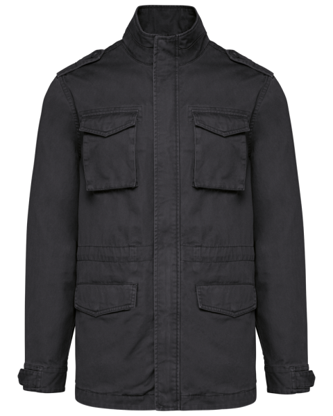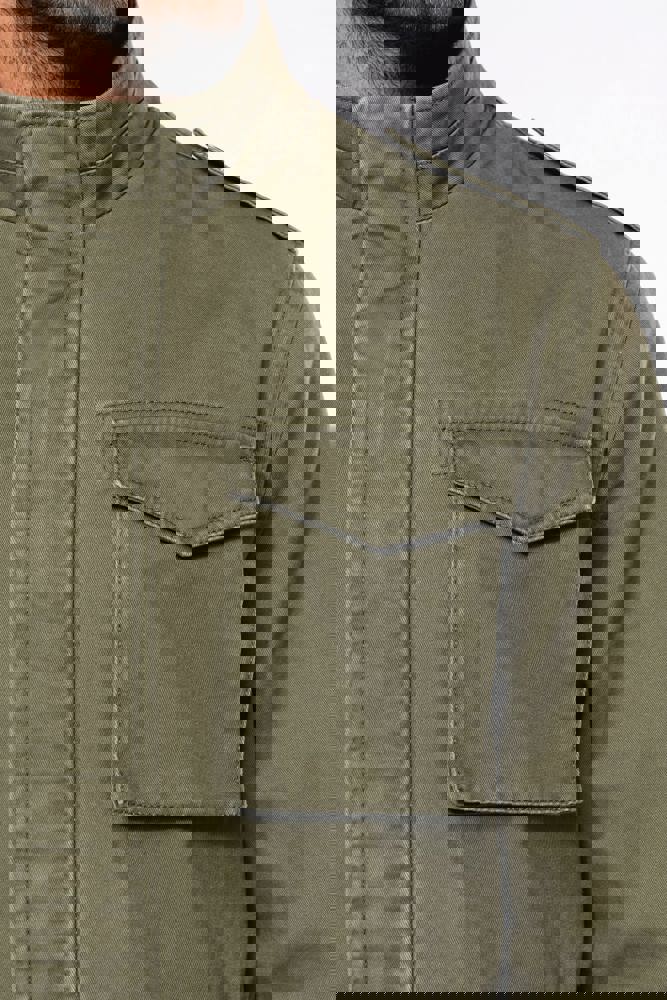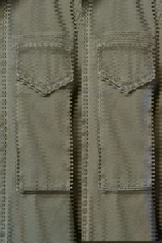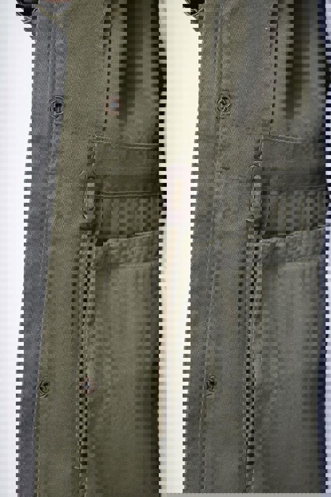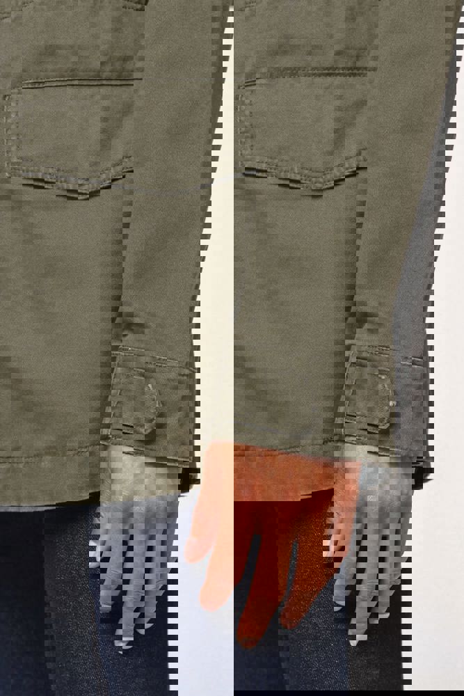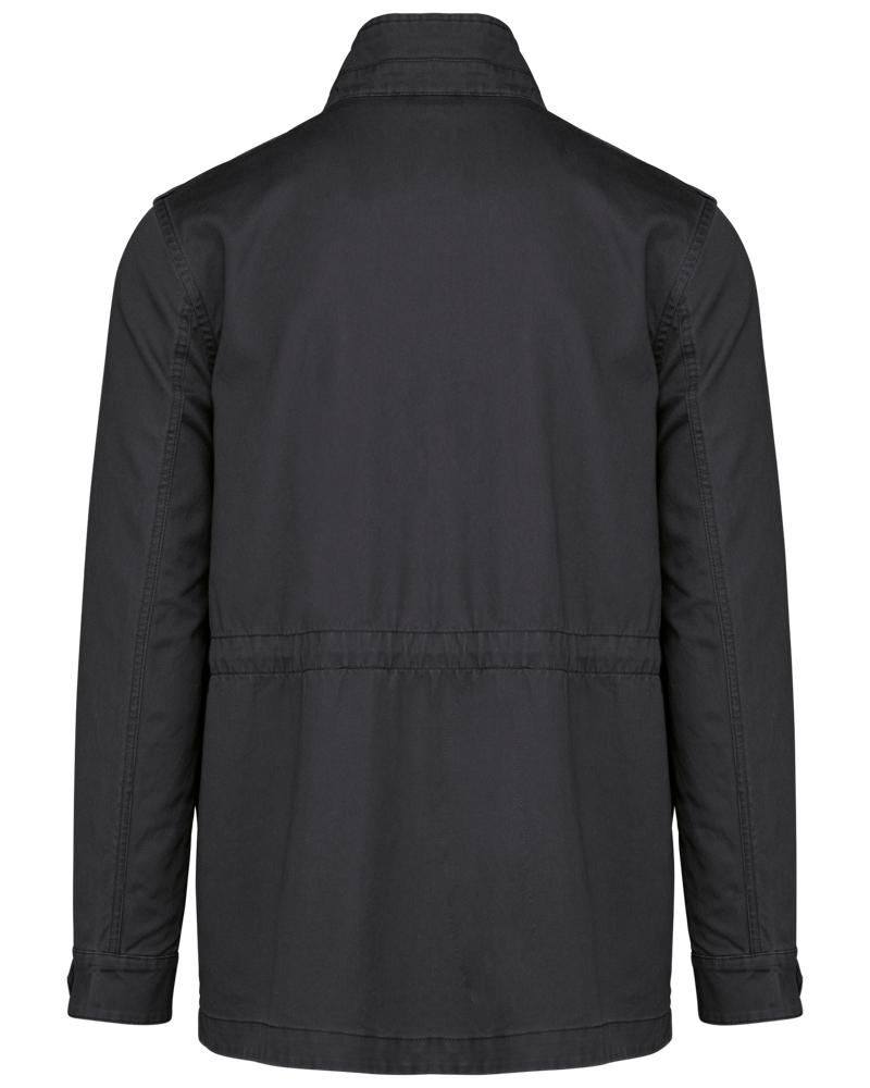 100% katoen. Twillconstructie. Regular fit. Gewassen kledingstuk. Deze techniek maakt dat er kleurverschillen kunnen zijn tussen de producten en elk stuk dus uniek is. Ritssluiting met een metalen schuiver en trekker in de hoofdstof, en een knooplijst met onzichtbare drukknopen in het midden vooraan. Binnenin afgewerkt met een oplegsel. Vier buitenzakken met een drukknoop. Pols met een sierlijst, samengehouden met een drukknoop. Verstelbare aanrijgkoordjes in de tailleband, met stopper met lederlook in het kledingstuk. Schouderlijst met knoop. Binnenzak met klittenband. Halve maan voor eenvoudige personalisatie en ophanglus binnenin.