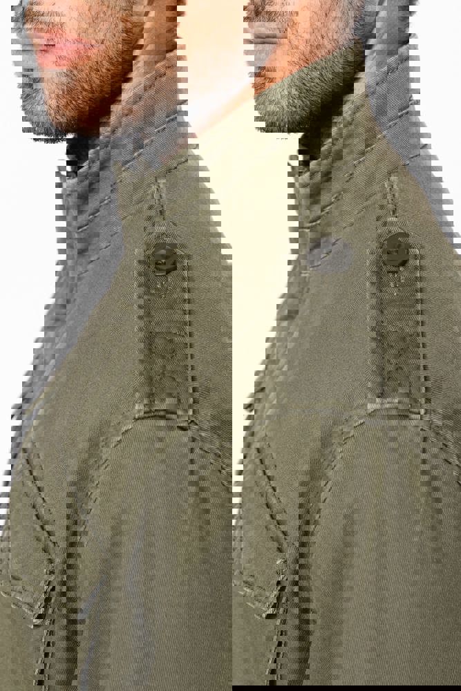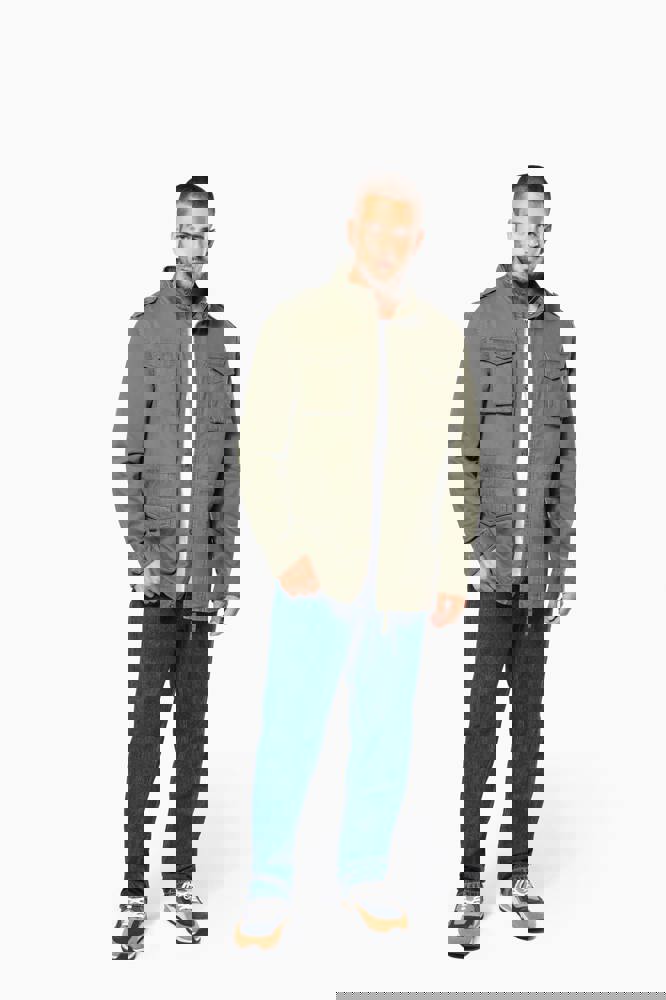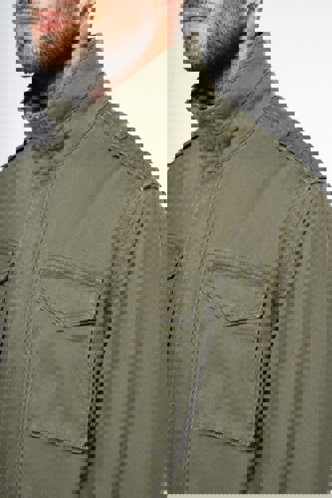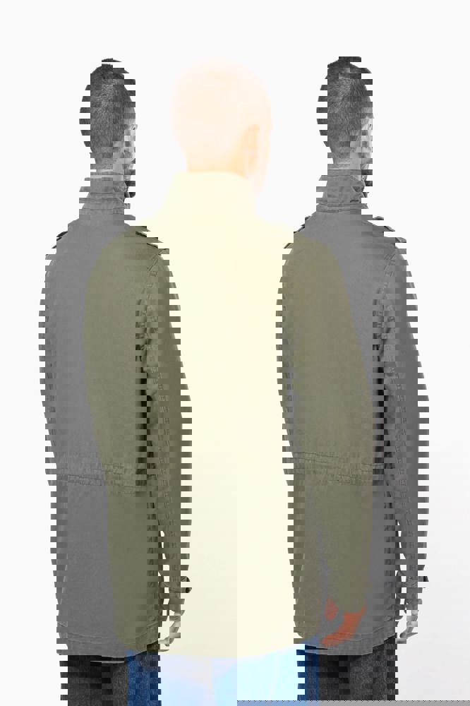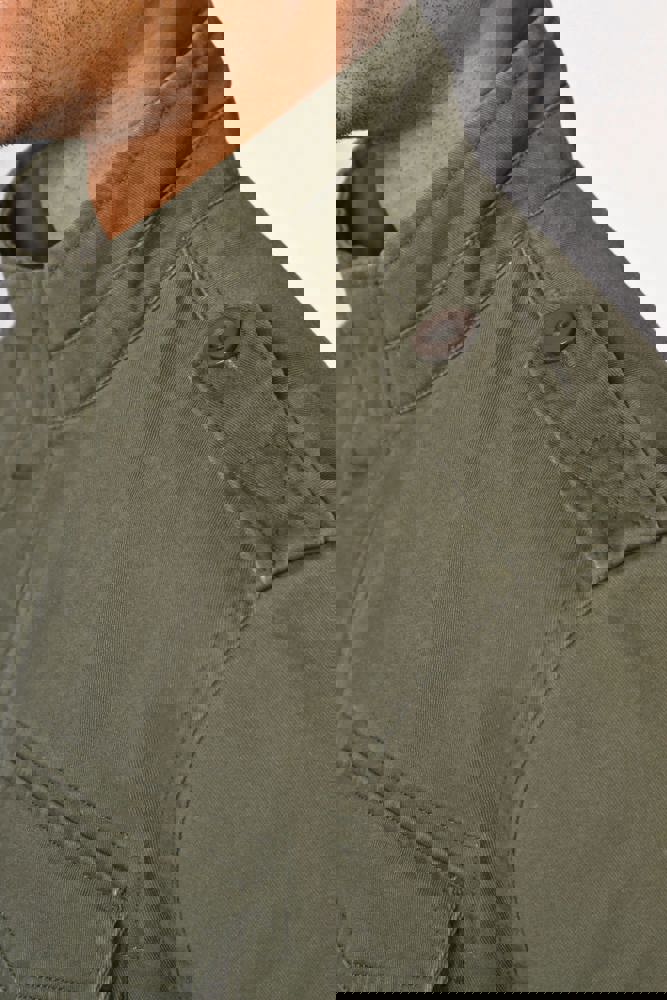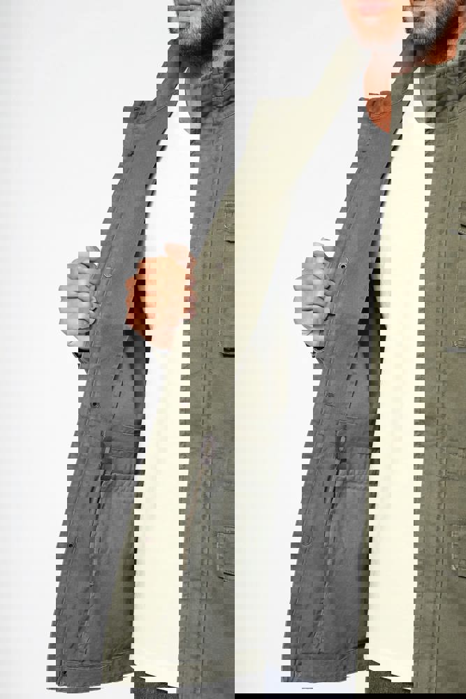 100% katoen. Twillconstructie. Regular fit. Gewassen kledingstuk. Deze techniek maakt dat er kleurverschillen kunnen zijn tussen de producten en elk stuk dus uniek is. Ritssluiting met een metalen schuiver en trekker in de hoofdstof, en een knooplijst met onzichtbare drukknopen in het midden vooraan. Binnenin afgewerkt met een oplegsel. Vier buitenzakken met een drukknoop. Pols met een sierlijst, samengehouden met een drukknoop. Verstelbare aanrijgkoordjes in de tailleband, met stopper met lederlook in het kledingstuk. Schouderlijst met knoop. Binnenzak met klittenband. Halve maan voor eenvoudige personalisatie en ophanglus binnenin.