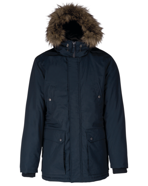 Dik canvas van 65% polyester / 35% katoen. Gewatteerde voering van 100% polyester. Verborgen ritssluiting onder een drukknooplijst. Gawatteerde en gevoerde capuchon met afneembaar nepbont. 4 buitenzakken aan de voorkant: 2 grote zakken met dubbele opening met klep met drukknoop en 2 omzoomde borstzakken met drukknoop. 1 binnenzak met klittenbandsluiting. Taille verstelbaar met aanrijgkoordjes binnenin. Mouwuiteinden in ribboord aan de binnenzijde. 1 rits aan de linkerkant en 1 drukkersrits.