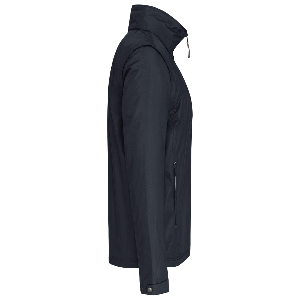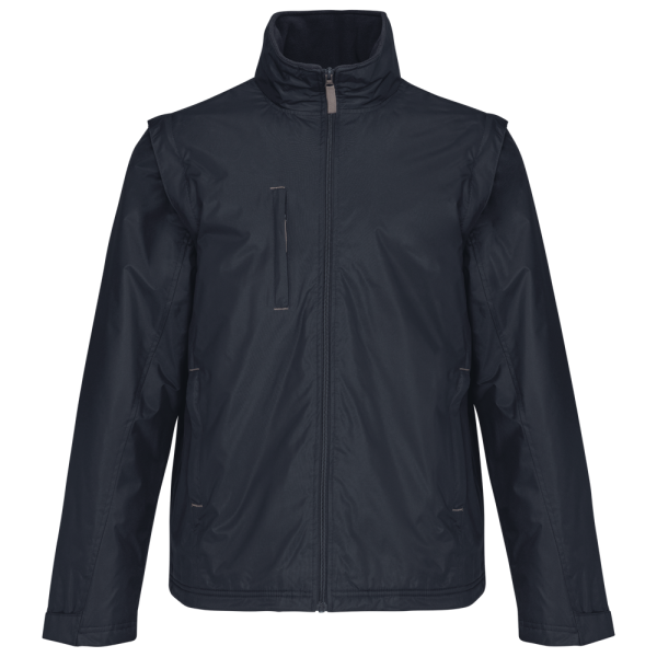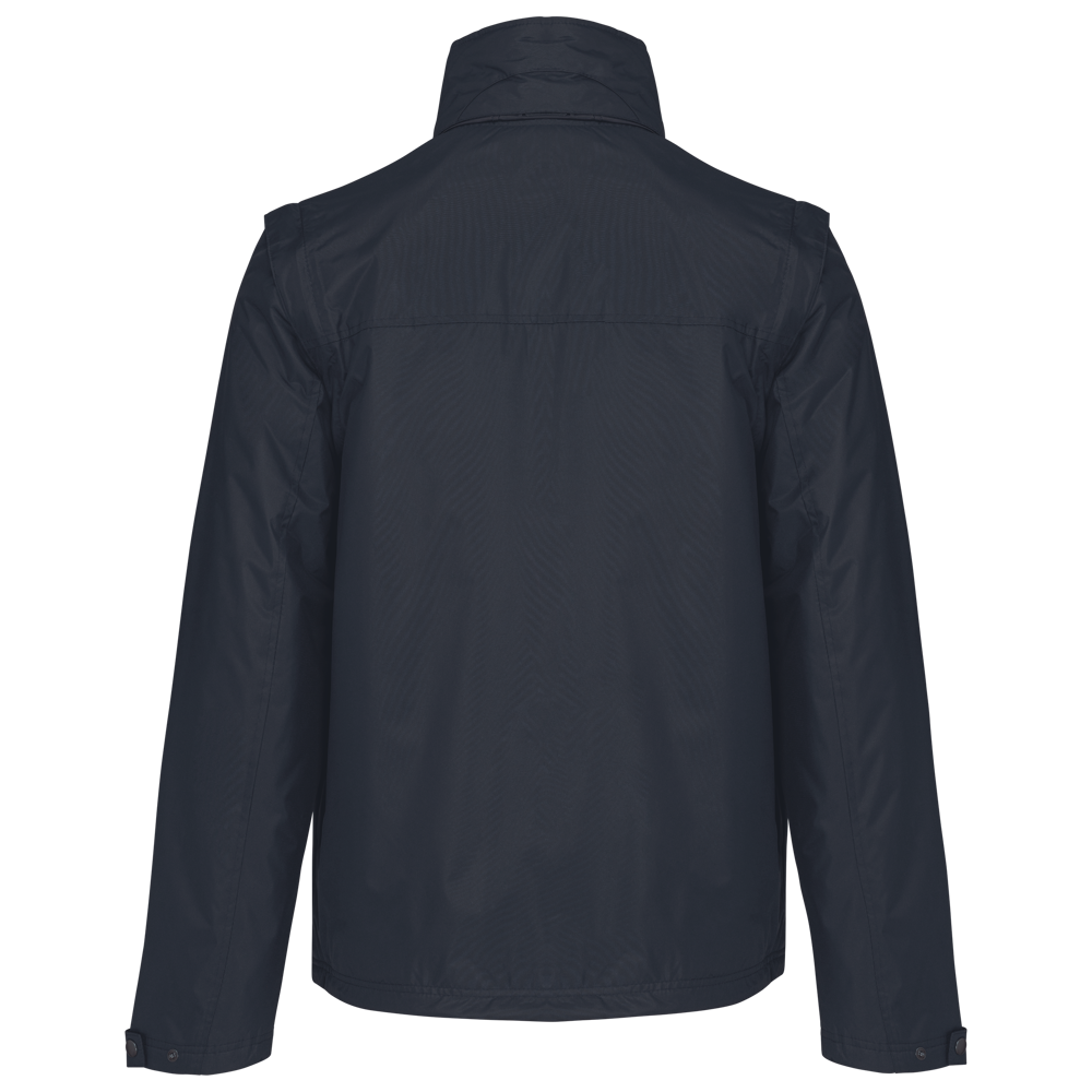 100% polyester met PVC inductie. 100% polyester fleecevoering. De voering van de mouwen is in 100% polyester + 100% polyesterwatten. Zachte stof. Volledige ritssluiting. 3 zakken met ritssluiting. Afritsbare mouwen. Verstelbare mouwuiteinden. Contrasterende ritstrekker, nektape en stopstiksels. 3 binnenzakken (2 met rits en 1 gsmzakje). Aanrijgkoord aan de binnenkant de jas. Capuchon verwerkt in de kraag. Drukkersrits.