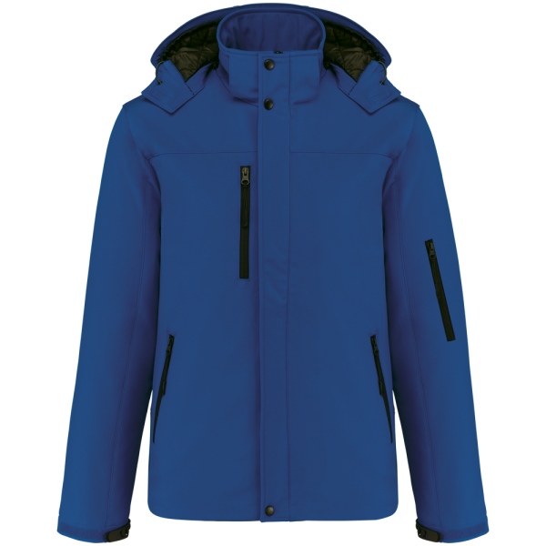 95% polyester / 5% elasthan. 3-laagse ademende stof 3000 g/m²/24 u en waterdicht 8000 mm. Buitenkant: 95% polyester / 5% elasthan. Tussenlaag: ademend membraan. Binnenlaag: microfleece. Gewatteerde voering van 100% polyester. Voorkant: 4 ritszakken (2 aan de zijkant, 1 op de mouw, 1 rechts op de borst). 2 binnenzakken met drukknoop. Afneembare capuchon met 3 gevoerde en gewatteerde panelen, regelbaar met stoppers. Met klittenband regelbare mouwuiteinden. 1 rits aan de linkerkant en 1 drukkersrits.