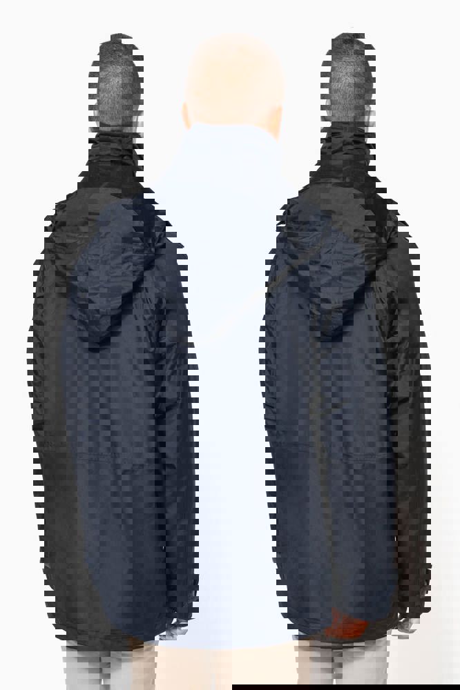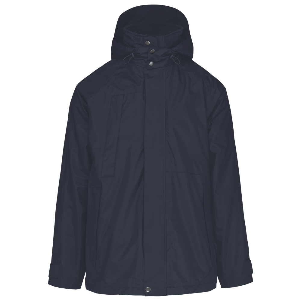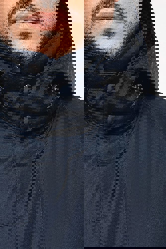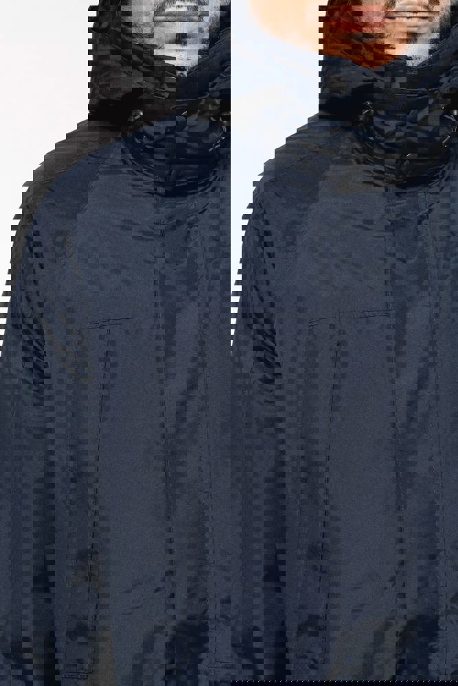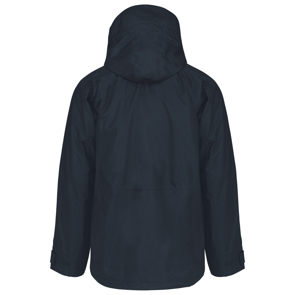 100% polyester met PVC coating. Waterdichte naden. PARKA 3-IN-1: Binnenkant: 100% netvoering van polyester en mouwen gevoerd met 100% polyester. Ritssluiting verborgen onder een lijst met drukknopen. Binnenkant van de kraag in fleecevoering. 3 zakken met rits en overslag. Regelbare mouwuiteinden met klittenbandsluiting. Afneembare capuchon met netvoering en sluiting door middel van drukknopen en stoppers. Drukkersrits. Fleecevest: 100% polyester microfleece. Mouwen gevoerd met 100% polyester om het vest eenvoudig uit en aan te trekken. Ritssluiting. 2 zijzakken. Uitneembaar fleecejack aan parka bevestigd met rits.
