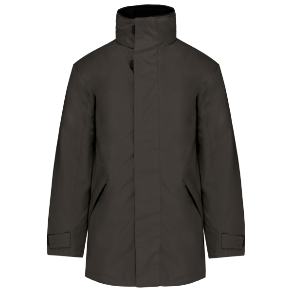 Buitenkant: 100% oxford polyester. Binnenkant: gewatteerd polyester. 2 voorzakken met rits. 2 binnenzakken waarvan 1 voor de GSM. Capuchon verborgen in de kraag. Kraag met fleecevoering. Drukkersrits. Ritssluiting verborgen onder een lijst met drukknopen en klittenband. Verstelbare mouwuiteinden met klittenband.