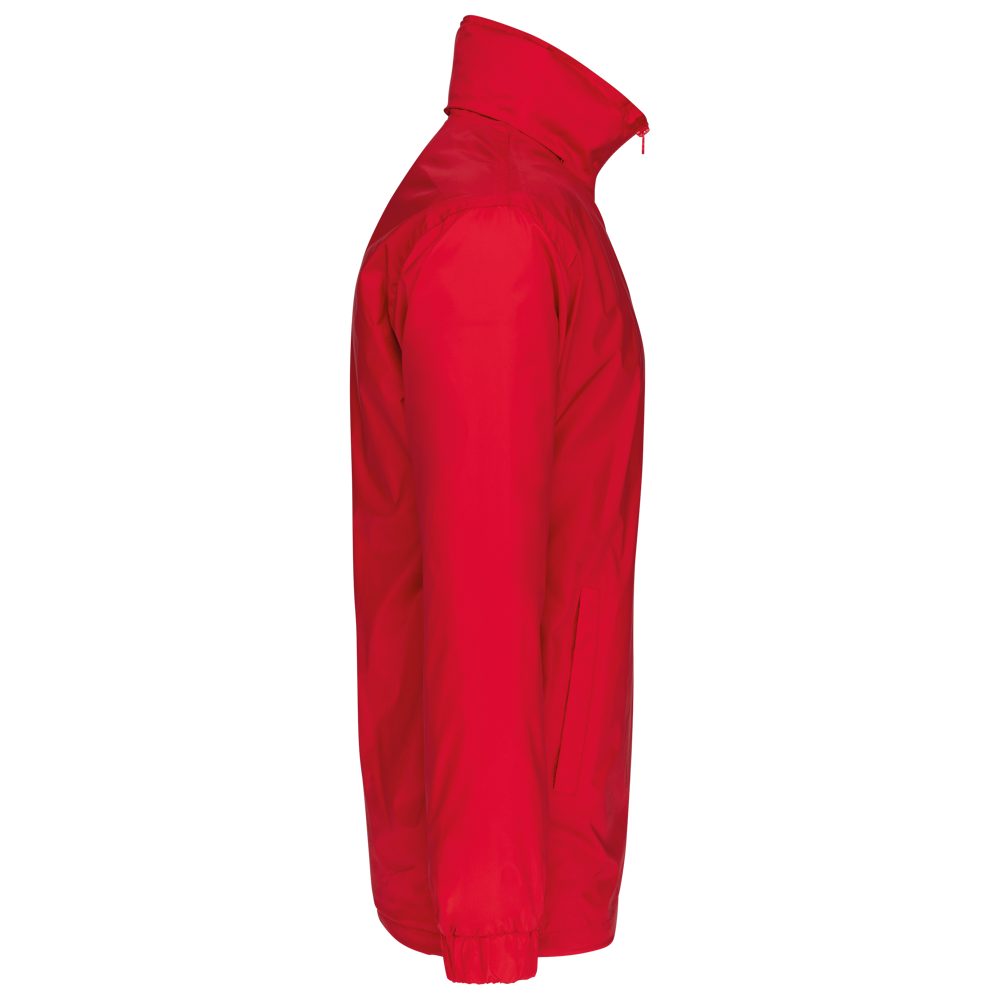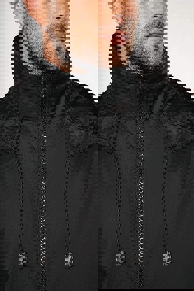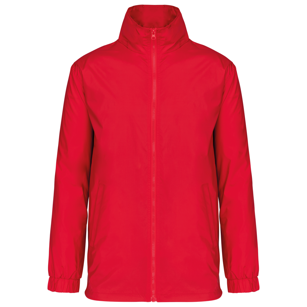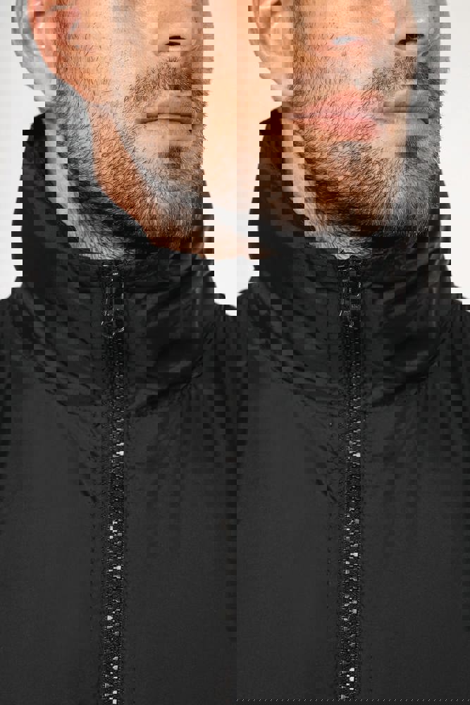 100% polyamide 210 T met acryl inductie. Grijze binnenvoering van 100% polyester single jersey. Ritssluiting. 1 binnenzak en 2 buitenzakken. Aanrijgkoord met stoppers onderaan. Capuchon in de kraag met elastisch koord. Drukkersrits.