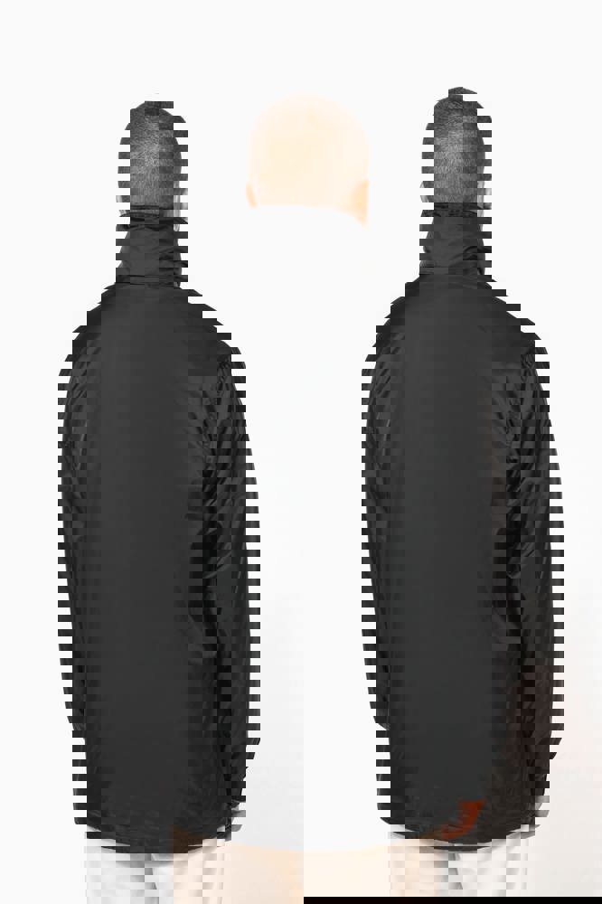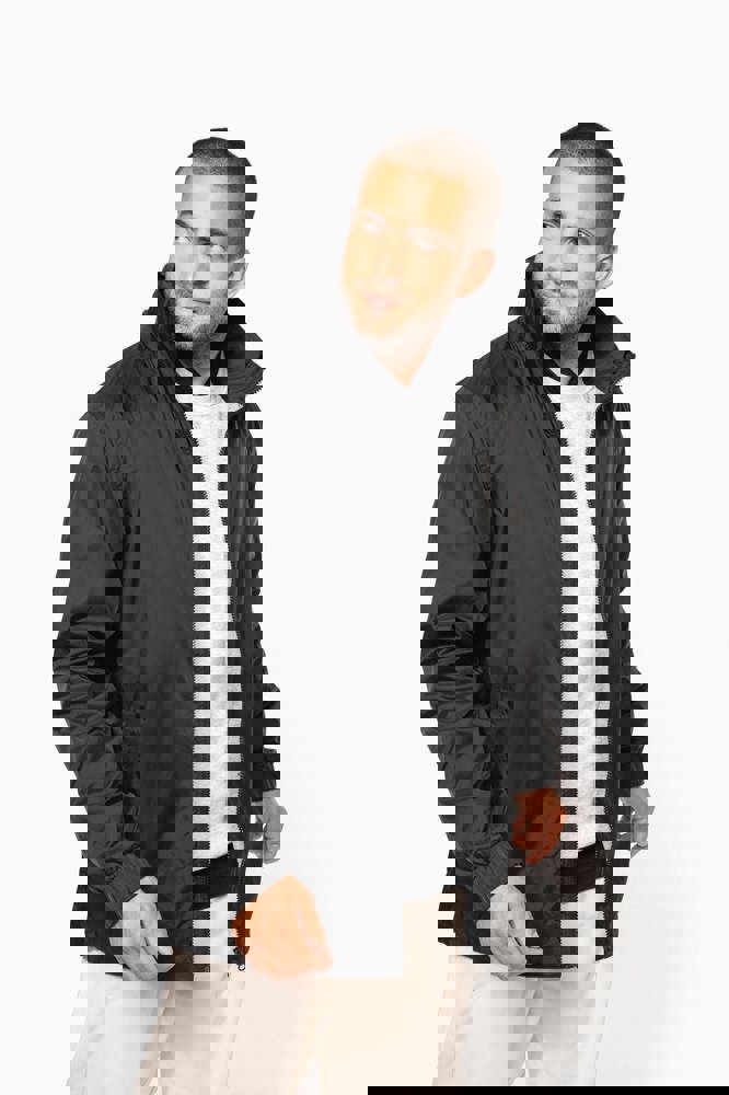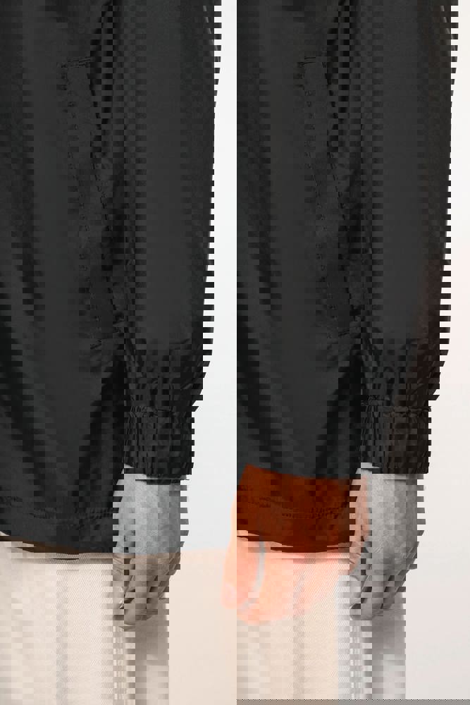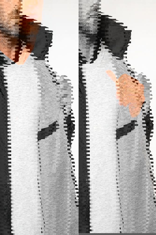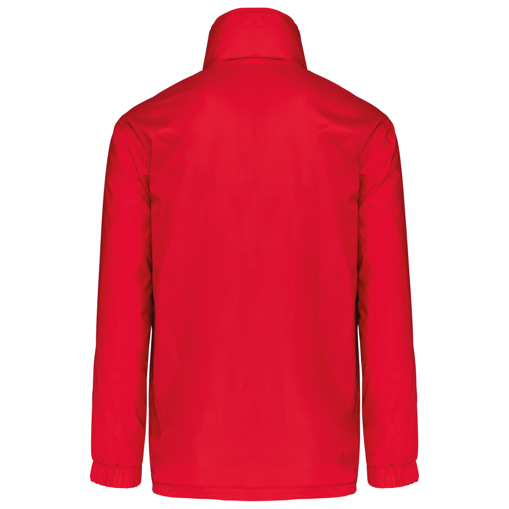 100% polyamide 210 T met acryl inductie. Grijze binnenvoering van 100% polyester single jersey. Ritssluiting. 1 binnenzak en 2 buitenzakken. Aanrijgkoord met stoppers onderaan. Capuchon in de kraag met elastisch koord. Drukkersrits.