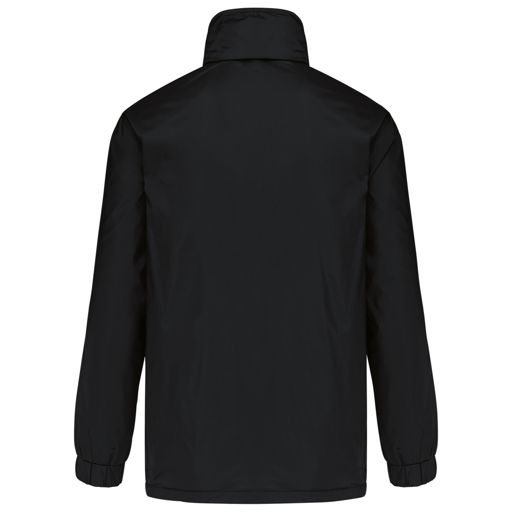 100% polyamide 210 T met acryl inductie. Grijze binnenvoering van 100% polyester single jersey. Ritssluiting. 1 binnenzak en 2 buitenzakken. Aanrijgkoord met stoppers onderaan. Capuchon in de kraag met elastisch koord. Drukkersrits.
