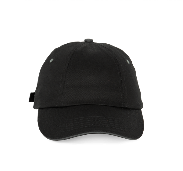 100% katoen twill. Eén segement aan de voorkant om de personalisatie te vereenvoudigen. Klep met contrasterende bies. Verstelbare sluiting met een metalen gesp.