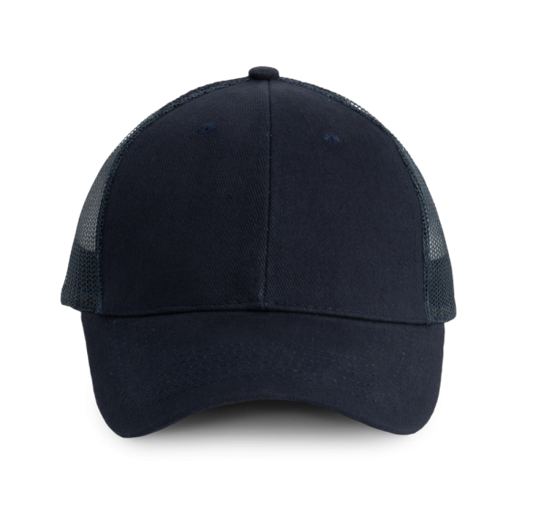100% katoen / 100% polyester. Pet Trucker met 6 panelen.De voorste panelen en de afgeronde zonneklep zijn gemaakt van katoen, de mesh van polyester. Met een verstelbare druksluiting van plastic.