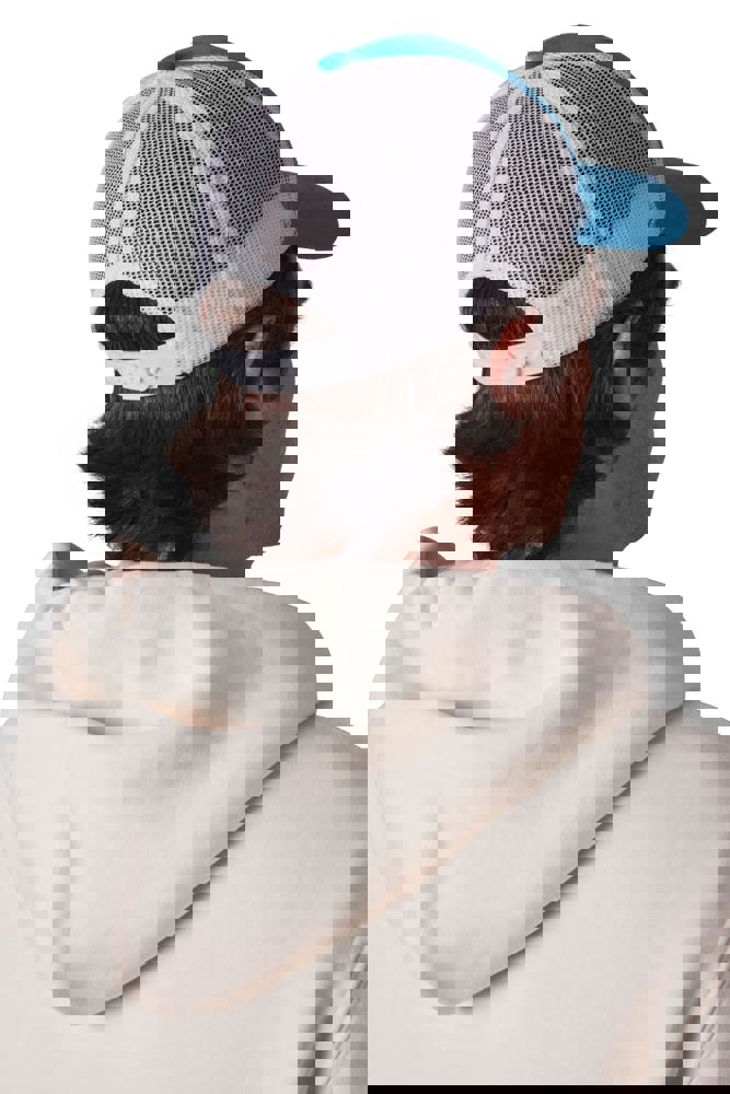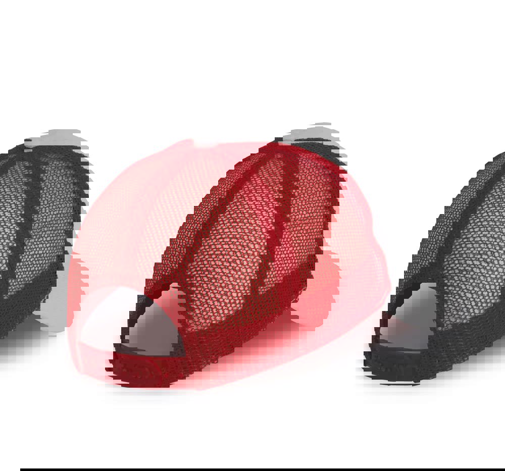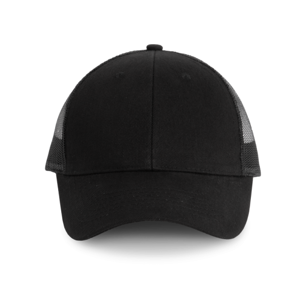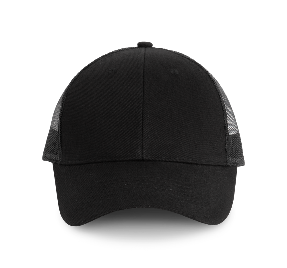 100% katoen / 100% polyester. Pet Trucker met 6 panelen.De voorste panelen en de afgeronde zonneklep zijn gemaakt van katoen, de mesh van polyester. Met een verstelbare druksluiting van plastic.