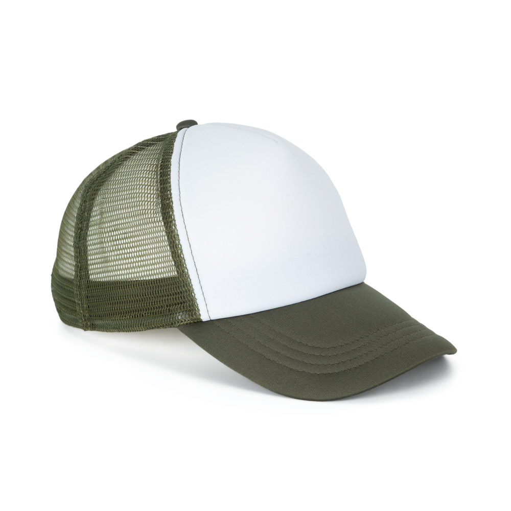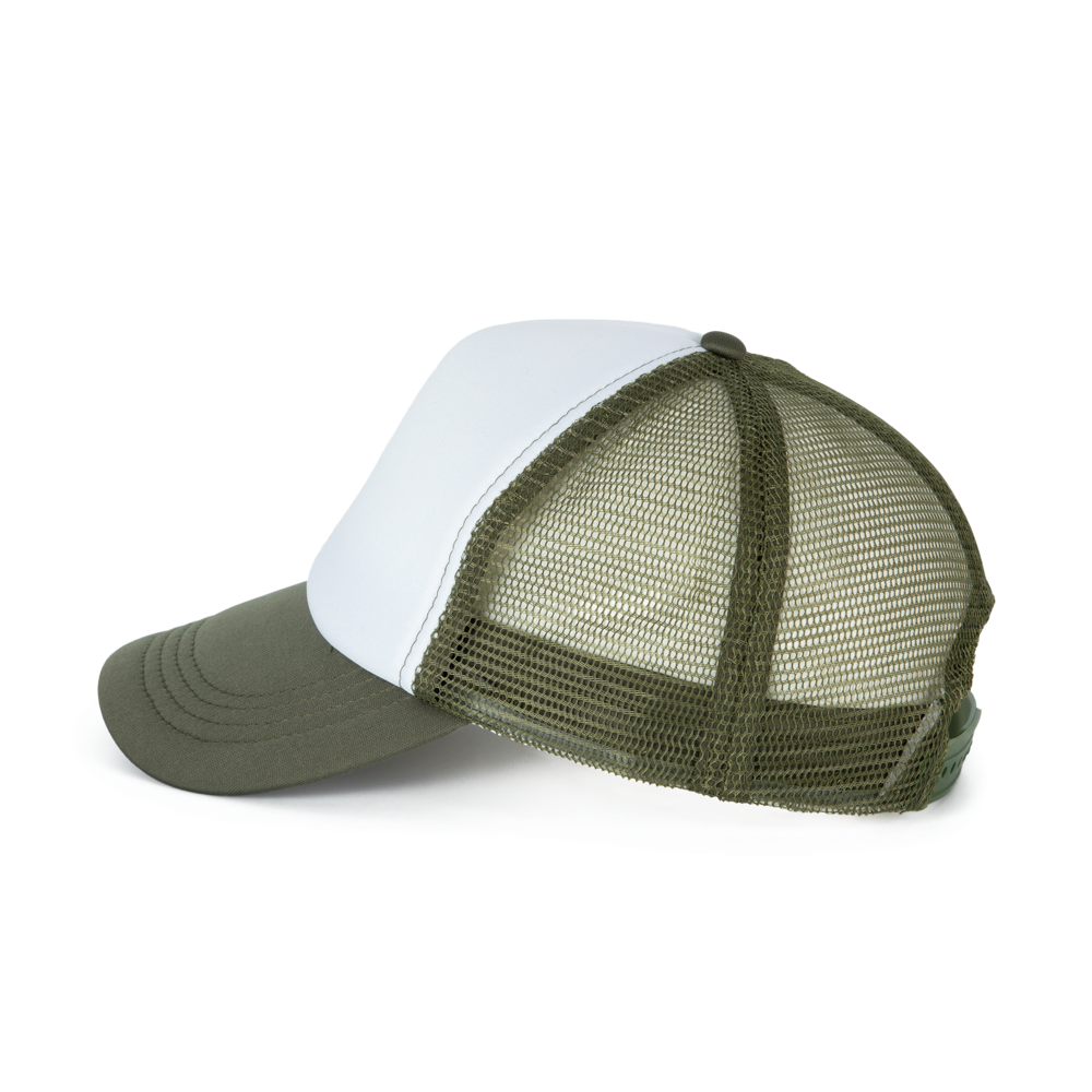 100% polyester met mesh van polyester aan de achterkant. 5 panelen. Eenvoudige aanpassing van het frontpaneel. Verstelbare druksluiting van plastic. Hoofdomvang: 53 cm.
