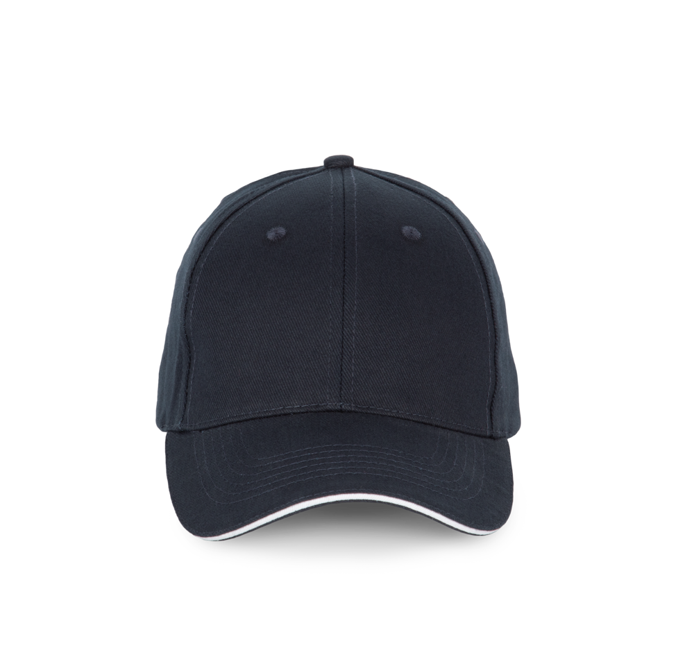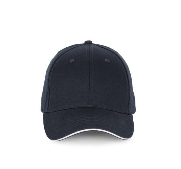 100% katoen. Pet met 6 panelen en contrasterende bies. Verstelbare sluiting met metalen gesp en zelfblokkerende lus.