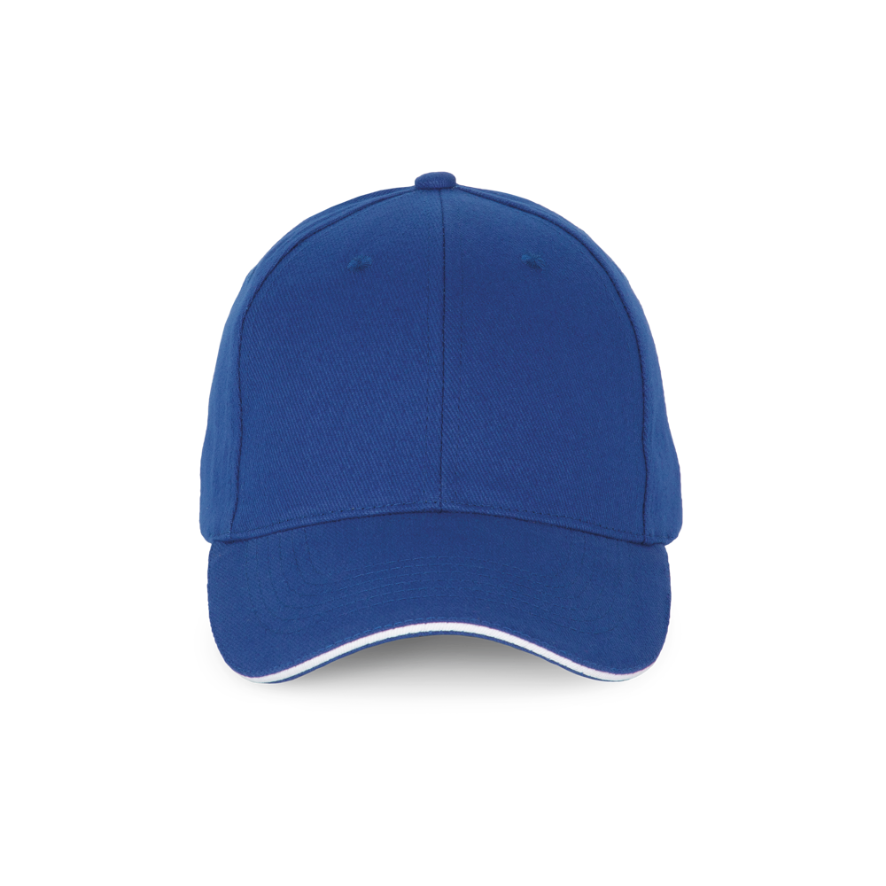 100% katoen. Pet met 6 panelen en contrasterende bies. Verstelbare sluiting met metalen gesp en zelfblokkerende lus.