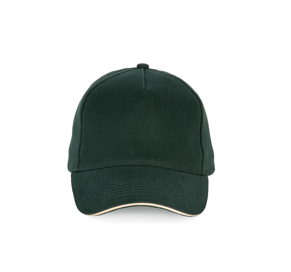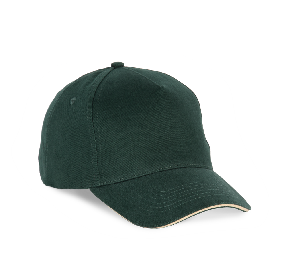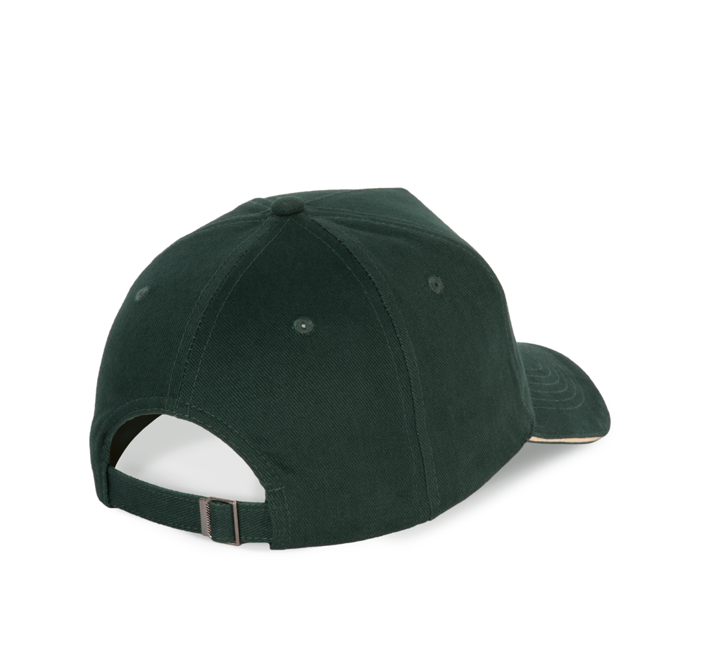 100% katoen. Pet met 5 panelen. Verstelbare sluiting met metalen gesp en zelfblokkerende lus.