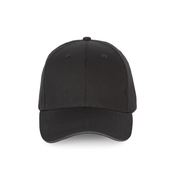 100% katoen. Pet met 6 panelen en contrasterende bies. Verstelbare sluiting met metalen gesp en zelfblokkerende lus.