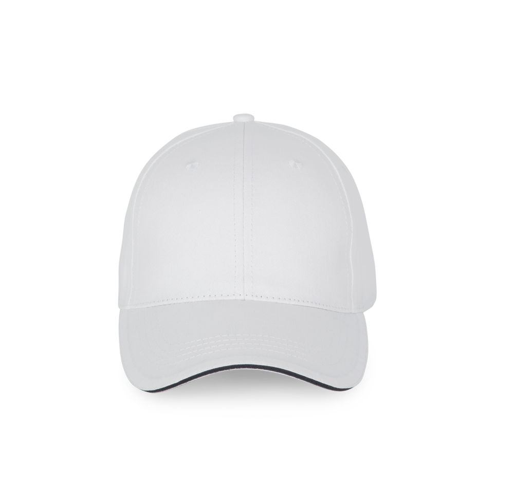 100% katoen. Pet met 6 panelen en contrasterende bies. Verstelbare sluiting met metalen gesp en zelfblokkerende lus.