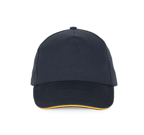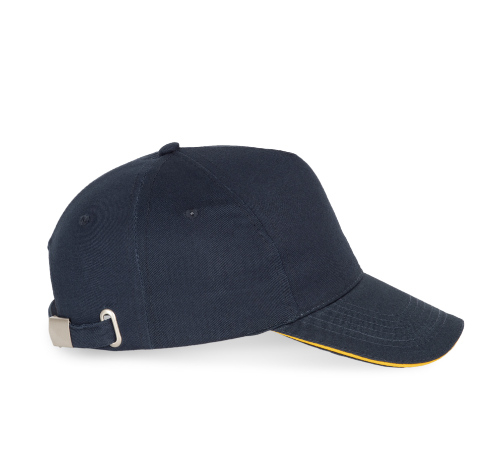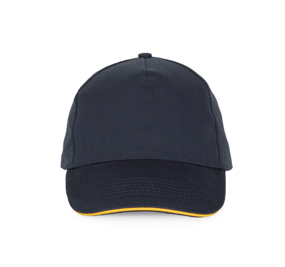 100% zwaar geborsteld sergé katoen. 5 panelen. Klep met contstrasterende bies. Katoenen zweetband. Verstelbare gesp-sluiting.