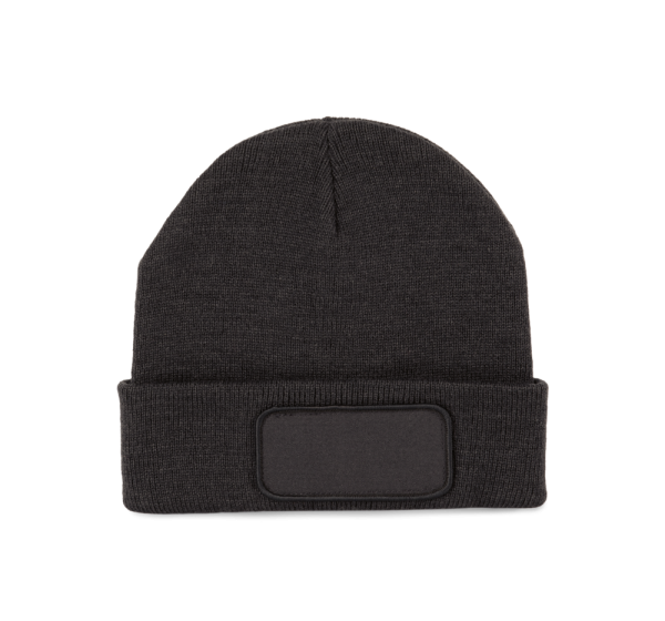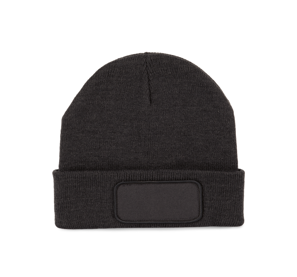 50% gerecycled polyester, 50% acryl. Muts met gebreide omslag in acryl en polyester. Katoenen patch aan de voorkant, voor eenvoudige personalisatie. Tear-away merklabel.