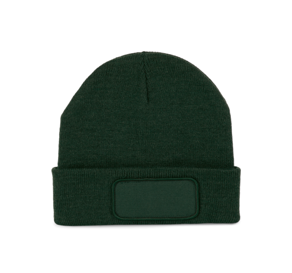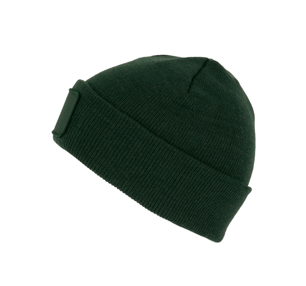 50% gerecycled polyester, 50% acryl. Muts met gebreide omslag in acryl en polyester. Katoenen patch aan de voorkant, voor eenvoudige personalisatie. Tear-away merklabel.