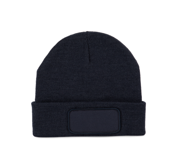 50% gerecycled polyester, 50% acryl. Muts met gebreide omslag in acryl en polyester. Katoenen patch aan de voorkant, voor eenvoudige personalisatie. Tear-away merklabel.