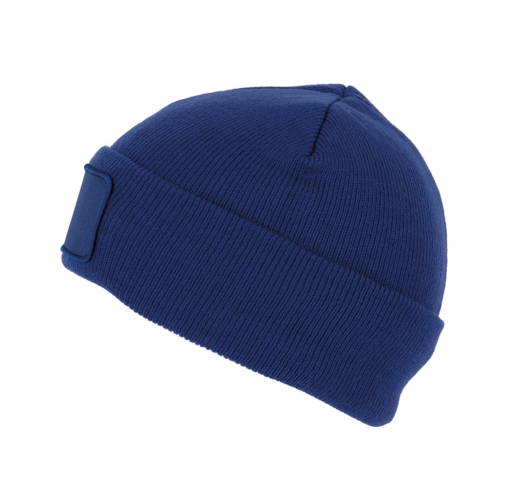 100% acryl. Gebreide muts met omslag in zacht acryl. Katoenen patch aan de voorkant, voor eenvoudige personalisatie. Heel comfortabele Thinsulate-fleecevoering. Tear-away merklabel.