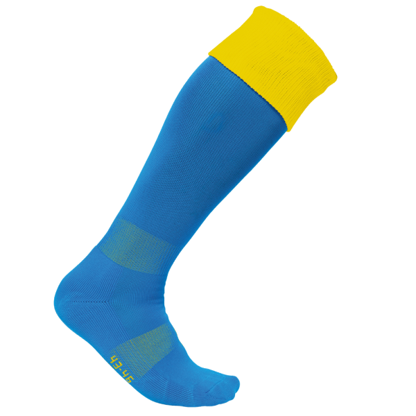 95% polyester / 3 %elastodieen / 2% elasthan. Elastische en contrasterende bovenzijde. Elastische anti-slipring aan de enkel. Sok met badstof aan de binnenkant.