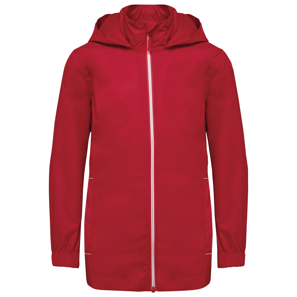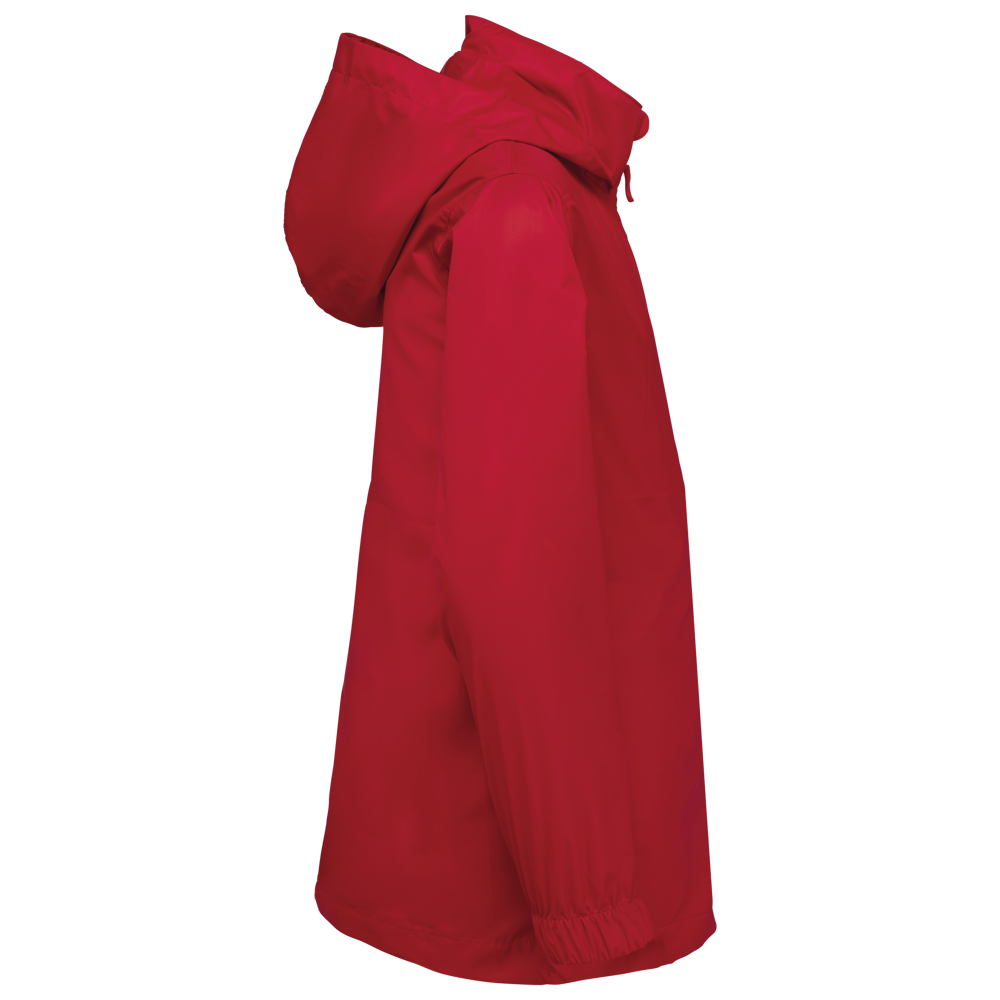 100% mat 210T polyester met PU-coating. Waterdichte stof 1500 mm. Waterdichte, thermisch verzegelde schoudernaden en capuchon. 2 zijzakken met rits en ritstrekker. 2 binnenzakken. Contrasterende ritssluiting vooraan. Capuchon in de kraag met klittenbandbevestiging. Elastische mouwuiteinden. Afneembaar merklabel.