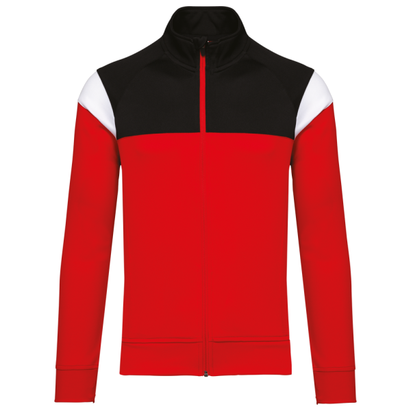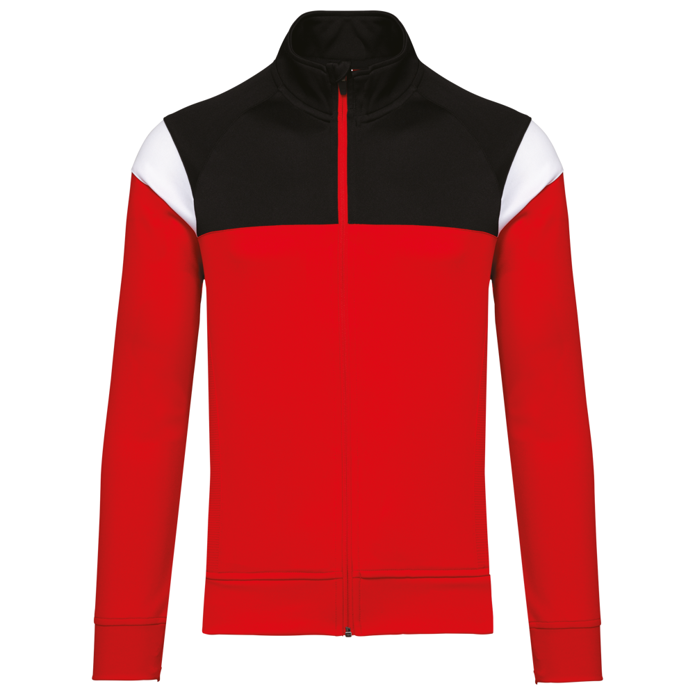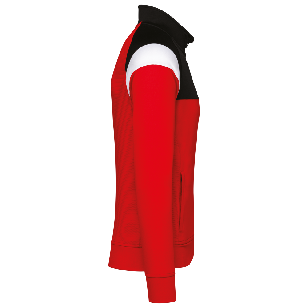100% mat interlockpolyester. Rechte snit. Sluit vooraan met een omgekeerde ton-sur-ton nylonrits. Raglanmouwen met contrasterende inzetsels aan de schouder. Contrasterend inzetsel aan schouder en borst. 2 ritszakken aan de voorkant. Inzetsels in textuurstof opzij en achteraan. Ritsafdekking boven aan de kraag, voor meer comfort. Afneembaar merklabel voor eenvoudige personalisatie.