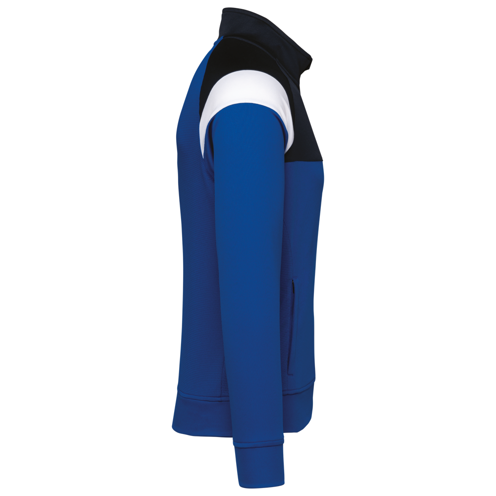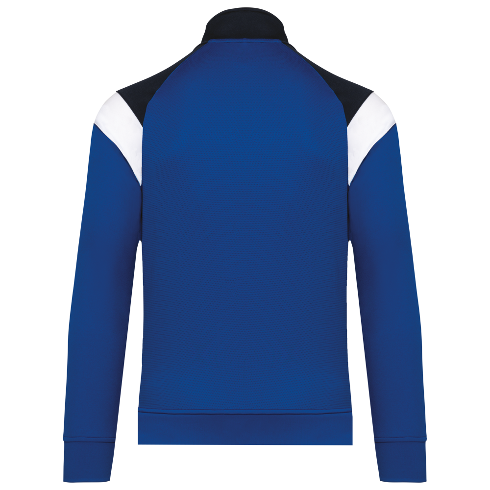 100% mat interlockpolyester. Rechte snit. Sluit vooraan met een omgekeerde ton-sur-ton nylonrits. Raglanmouwen met contrasterende inzetsels aan de schouder. Contrasterend inzetsel aan schouder en borst. Aangezette boord in de hoofdstof aan de mouwuiteinden en de onderkant. 2 ritszakken aan de voorkant. Inzetstukken in textuurstof opzij en achteraan. Ritsafdekking boven aan de kraag, voor meer comfort. Afneembaar merklabel voor eenvoudige personalisatie.
