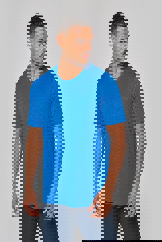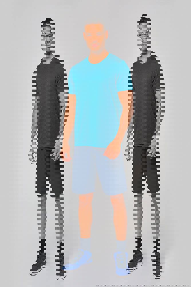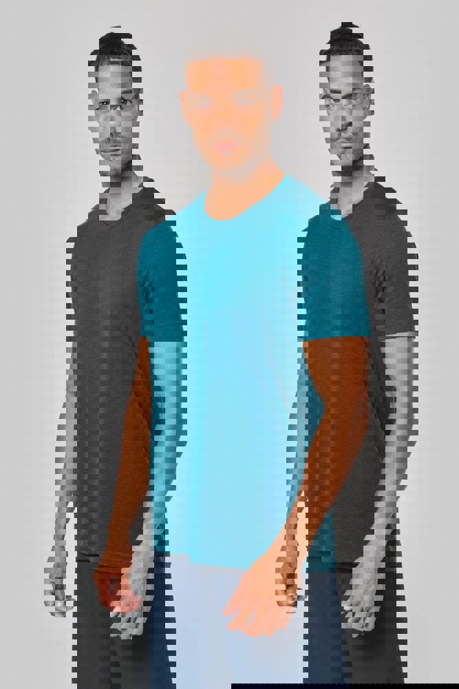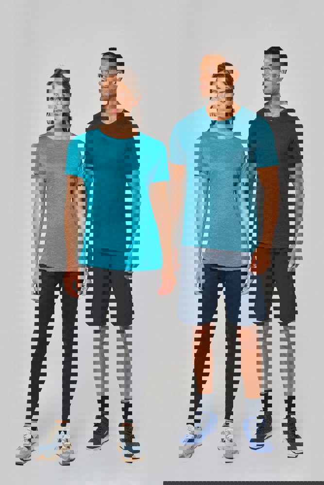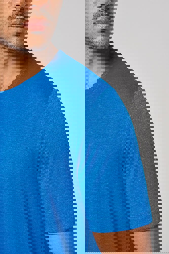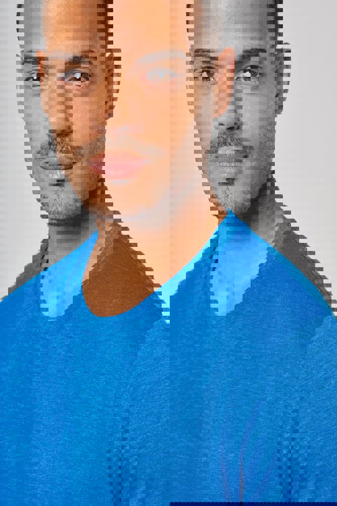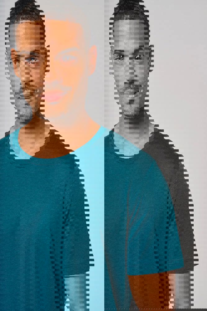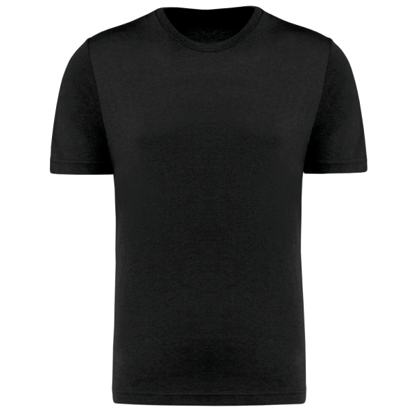 50% polyester / 25% katoen / 25% viscose. Jerseystof. Toon-op-toon nektape. Dubbel stiksel aan mouwuiteinden en onderkant. Geen merklabel in de kraag, maar enkel een maatlabel voor eenvoudige personalisatie.
