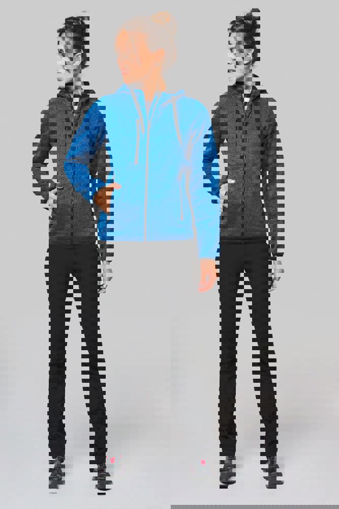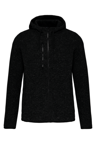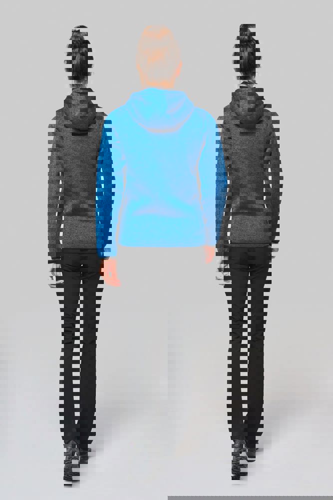 Geborstelde binnentricot 100% polyester. 2 contrasterende ritszakken aan de voorkant en 1 contrasterende borstzak met rits. Capuchon met contrasterende jerseyvoering van 100% katoen met platte, contrasterende aanrijgkoordjes. Mouwuiteinden en onderkant kledingstuk, afgewerkt met contrasterende, elastische biaisband. Overlocksteek op de inzetstukken.
