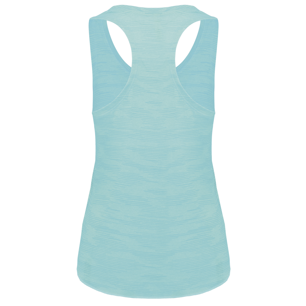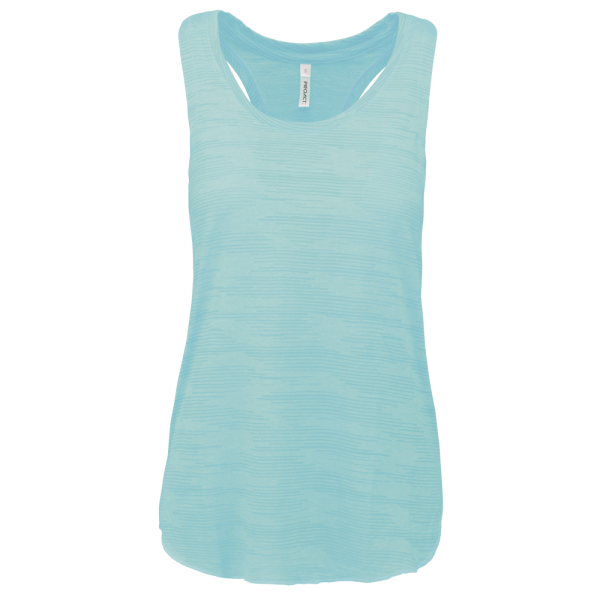 65% polyester / 35% viscose - Soepel jersey met gevlamd effect. Ruime snit. Grote armsgaten en racerback. Ronde halsopening met nektape aan de binnenkant. Licht afgerond boord.