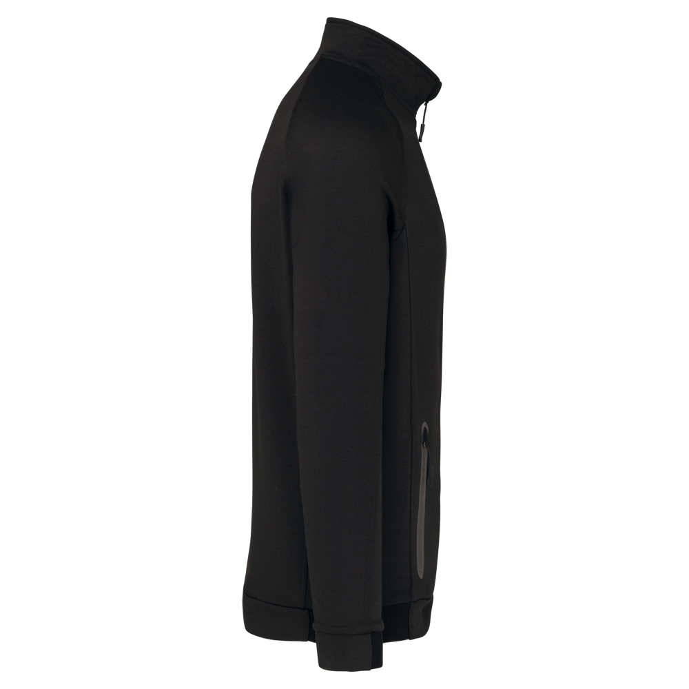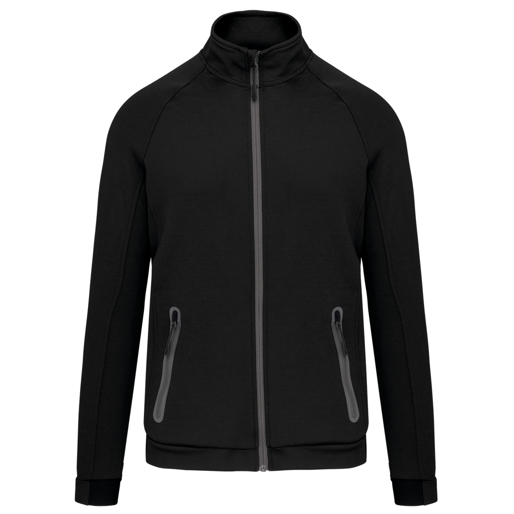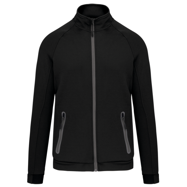 94% polyester / 6% elasthan (79% polyester / 15% viscose / 6% elasthan voor Heather kleur). Hele comfortabele stof. Ritssluiting. 2 ritszakken met warmtegelaste afwerking aan de voorkant. Nauwsluitende boorden aan de mouwen en onderaan, met een elastisch stuk Black op alle kleuren en Dark Grey op de Ash Heather (sluitingen ook). Ideaal om te dragen op trainingsbroek PA1008 in een total Urban Apparel stijl.
