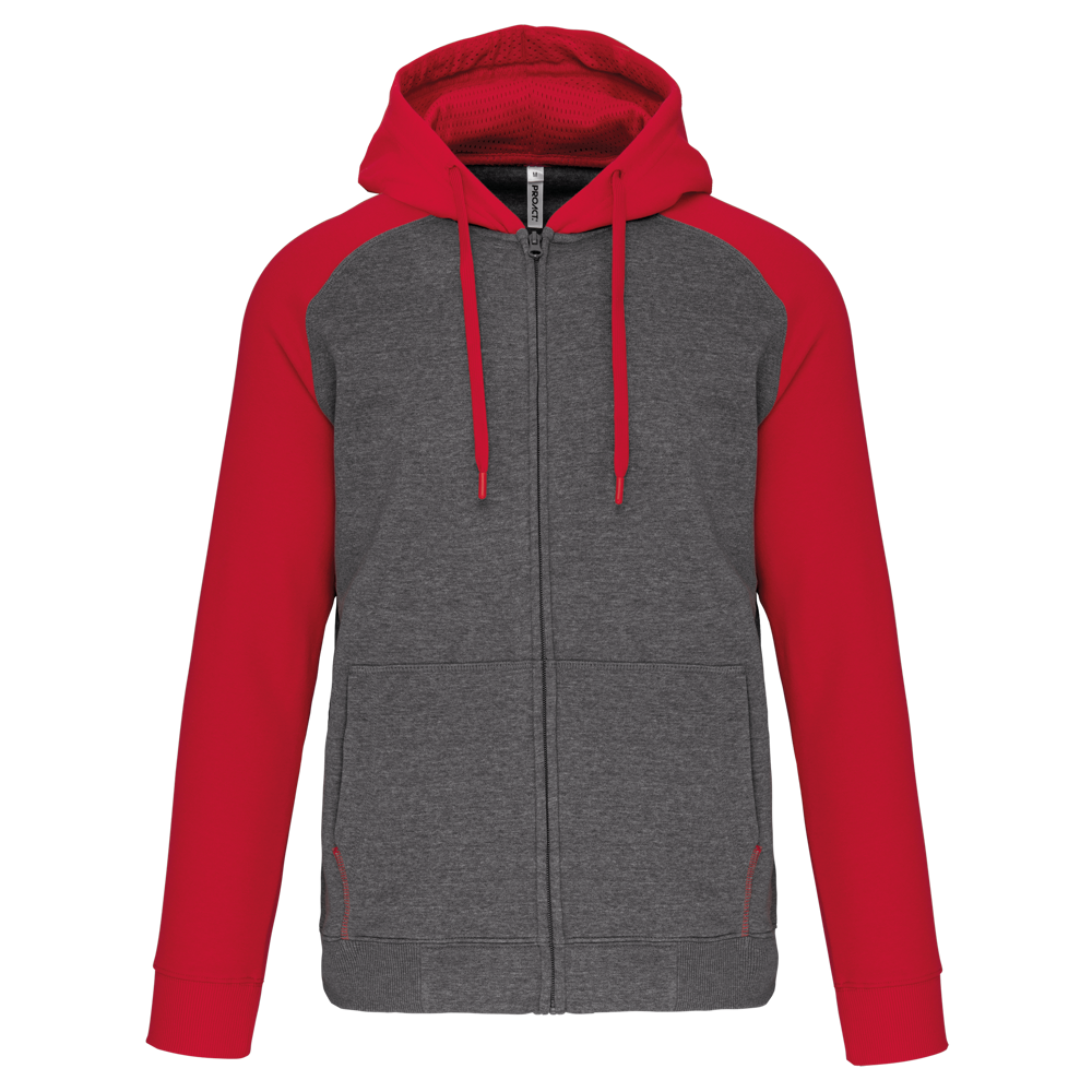 65% polyester / 35% katoen. Geborsteld fleece aan de binnenkant. Ritssluiting. Contrasterende raglanmouwen en capuchon. Capuchon gevoerd met toon op toon mesh. Kangoeroezakken met fluorescerend gsm-zakje. Opening voor headset-snoer. Mouwboorden en onderzijde in 2x2 ribboord met dubbele dikte.