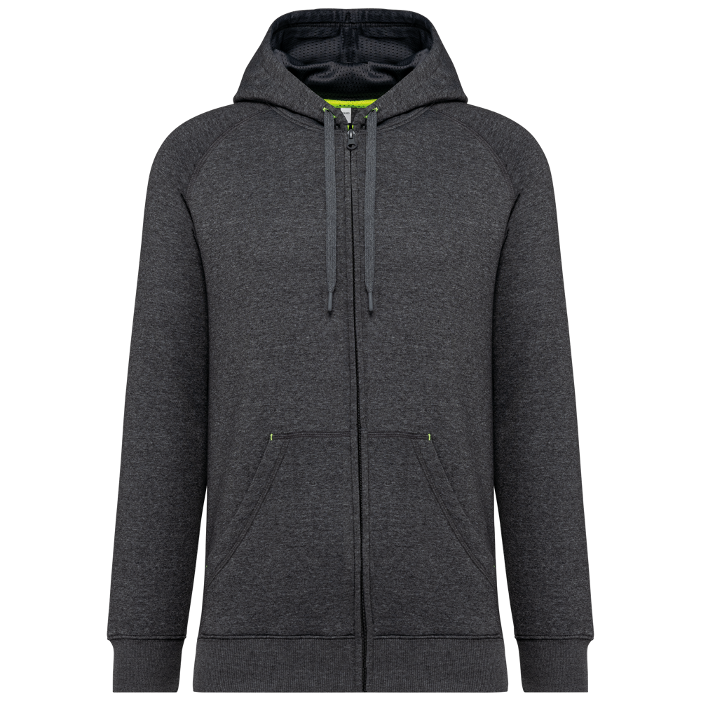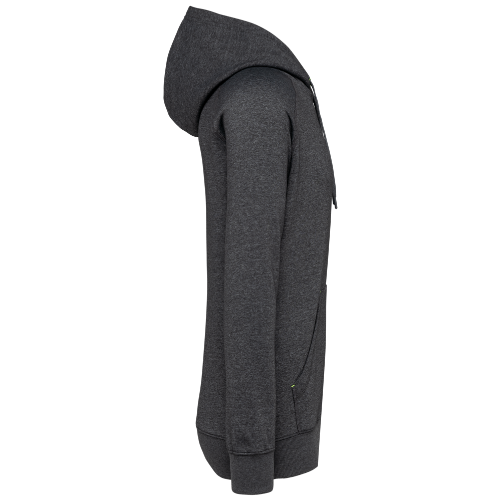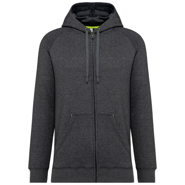 65% polyester / 35% katoen. Vortex-garen. Geborsteld fleece aan de binnenkant. Gekamd katoen. Rechte snit. Raglanmouwen. Nylon ritssluiting. Capuchon gevoerd met toon op toon mesh. Kangoeroezakken met 1 fluorescerend gsm-zakje. Nektape aan de binnenkant van de capuchon, ringetjes voor de koordjes van de capuchon en stoppunten in fluokleurtjes op de zakken. Mouwboorden en onderzijde in 2x2 ribboord met dubbele dikte. Halvemaanvormige halsopening op de achterkant, voor eenvoudige personalisatie van het merk aan de binnenkant. Tear-away merklabel.
