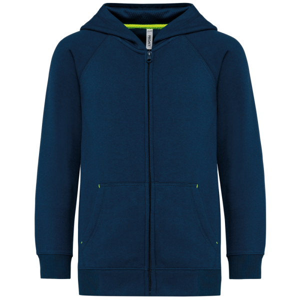 65% polyester / 35% katoen. Geborsteld fleece aan de binnenkant. Gekamd katoen. Vortex-garen. Rechte snit. Raglanmouwen. Nylon ritssluiting. Capuchon gevoerd met toon op toon mesh. Nektape aan de binnenkant van de capuchon en stoppunten in fluokleurtjes op de zakken. Kangoeroezakken met 1 fluorescerend gsm-zakje. Mouwboorden en onderzijde in 2x2 ribboord met dubbele dikte. Halvemaanvormige halsopening op de achterkant, voor eenvoudige personalisatie van het merk aan de binnenkant. Tear-away merklabel.