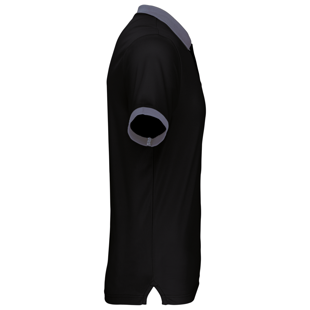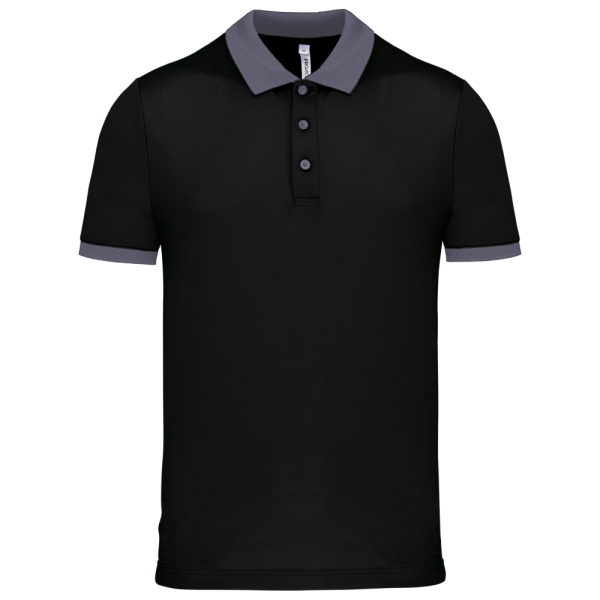 100% piquépolyester Cool Plus®. Rechte snit en moderne look. Kraag en mouwuiteinden in contrasterende ribboord. Knoopsluiting met 3 knopen (contrasterend of effen, afhankelijk van het model). Zijsplitten.